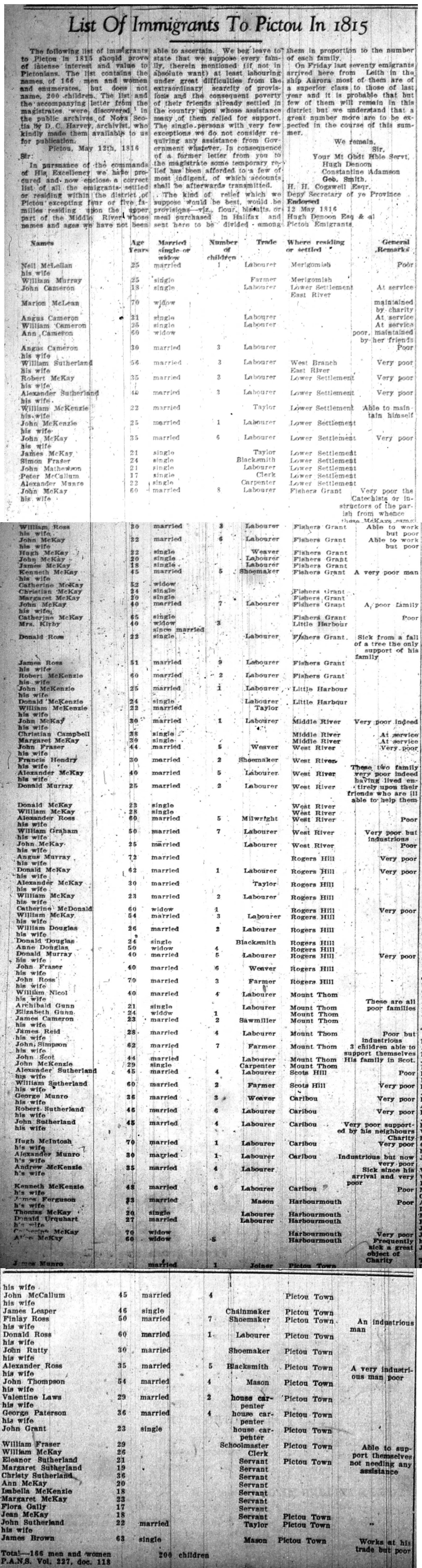 The following list of immigrants to Pictou in 1815 should prove of intense interest and value to Pictonians. The list contains the names of 166 men and women and enumerates, but does not name 200 children. The list and the accompanying letter from the magistrates were discovered in the public archives of Nova Scotia by D.C. Harvey, archivist, who kindly made them available to us for publication.