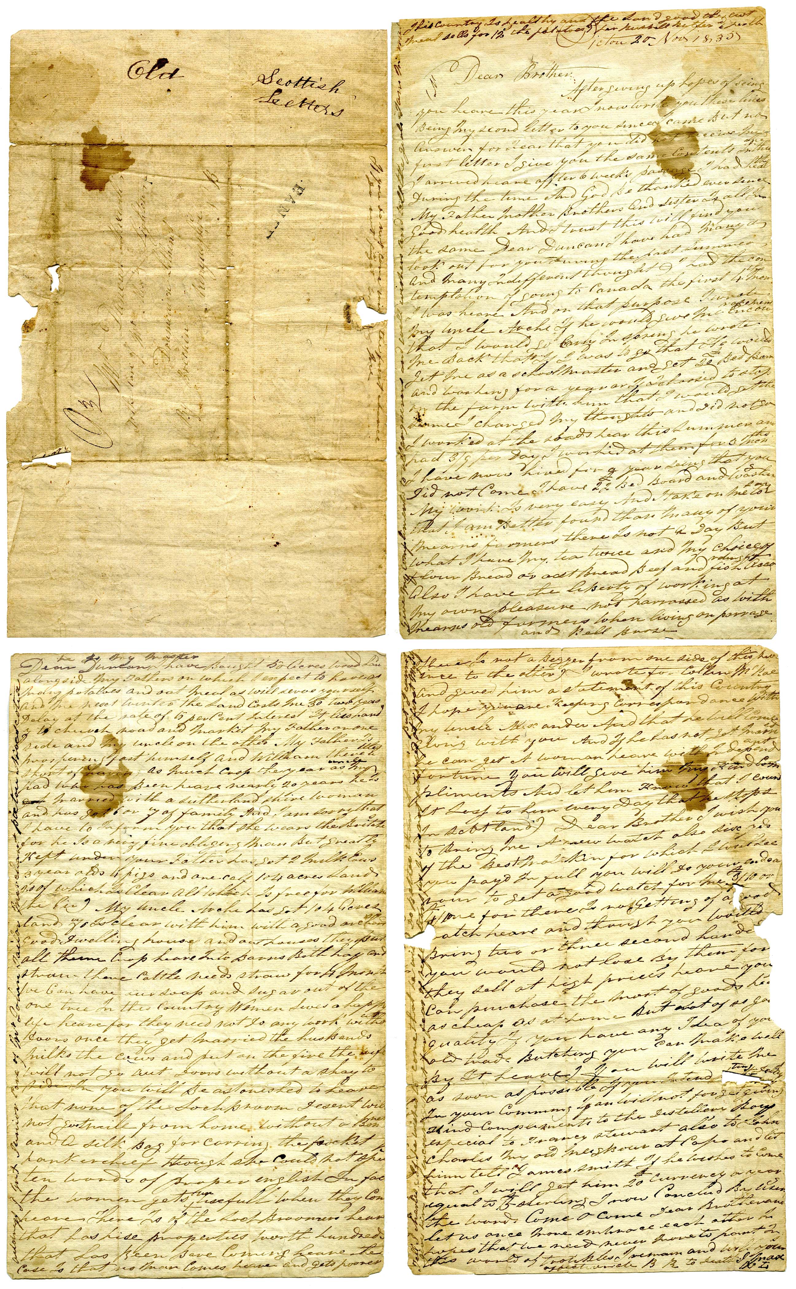 There is not a beggar from one side of this province to the other. I wrote from Collin McRae and gave him a statement of this Country. I hope you are keeping correspondence with my uncle Alexander and tat he will come along with you and if he has not got married he can get a woman here with independent fortune. You will give him my kind compliments and let him know that I count it loss to him every day that he stops in Scotland. Dear Brother I wish you to bring me a new watch also six yards of the best moleskin for which I will – paid in full. You will do your endeavour to get a good watch for me £3/10 or £4/one for there is not getting of a good watch here and though you would bring two or three second hand—you would not lose by them for they sell at high prices here you can purchase the – of goods here as cheap as at home but not of as good quality. If you have any idea of your old trade butchering you can make well by it here. If you will write me as soon as possible if you intend [putting] a delay in your coming --- will not forget giving kind compliments to the distillery boys especially to Francy Stewart also to John Charles my old neighbour at Cape and let him tell James Smith if he wishes to come that I will get him £20 currency a year equal to £15 sterling. I now conclude by using the words Come O Come Dear Brother and let us once more embrace each other in hopes that we need never have to part in this world of troubles I remain and will your affectionate B B to Death J Maxwell