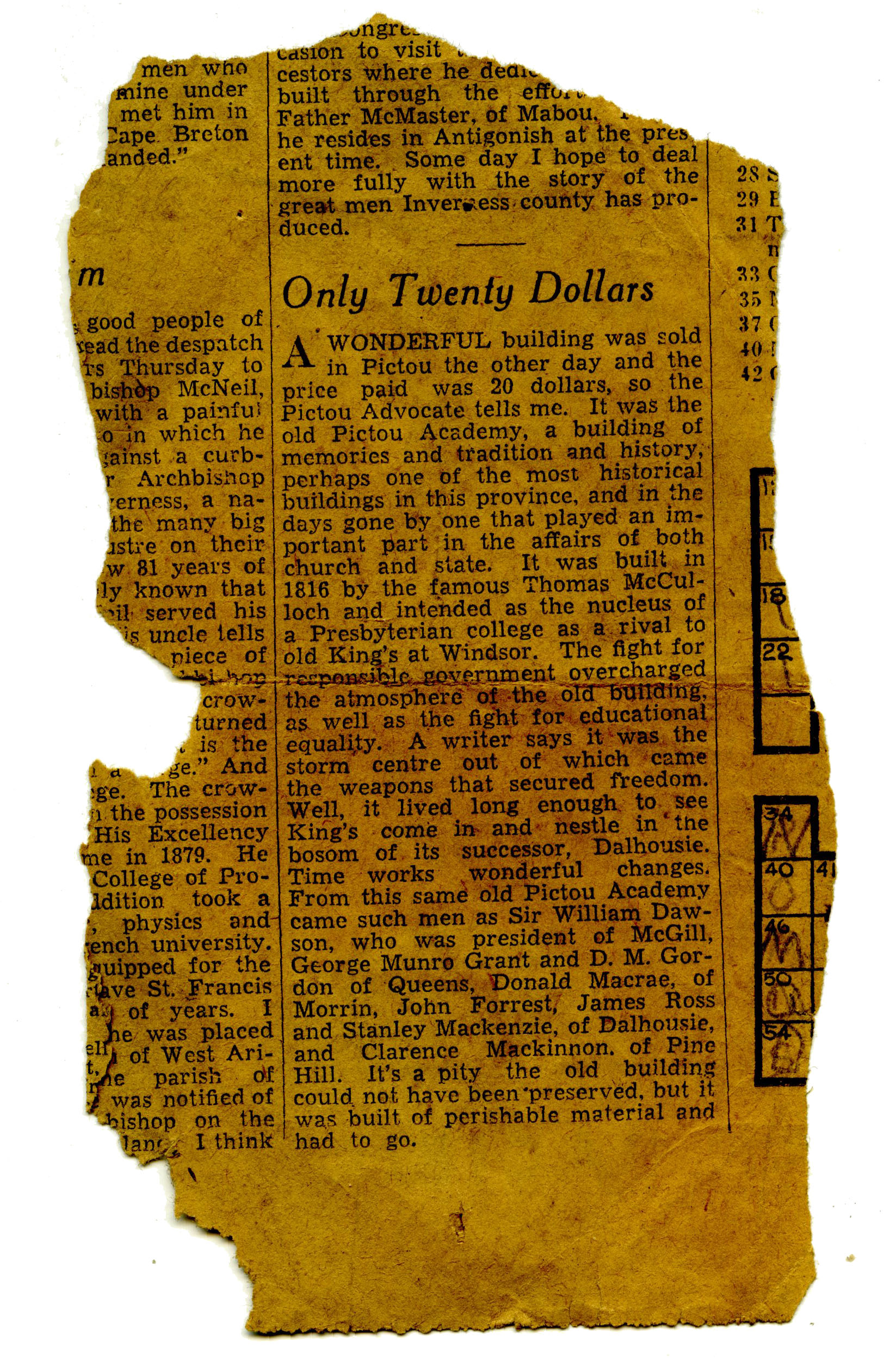 A wonderful building was sold in Pictou the other day and the price paid was 20 dollars, so the Pictou Advocate tells me. It was the old Pictou Academy, a building of memories and tradition and history, perhaps one of the most historical buildings in this province, and in the days gone by one that played an important part in the affairs of both church and state. It was built in 1816 by the famous Thomas McCulloch and intended as the nucleus of a Presbyterian college as a rival to old King's at Windsor. The fight for responsible government overcharged the atmosphere of the old building, as well as the fight for educational equality. A writer says it was the storm centre out of which came the weapons that secured freedom. Well, it lived long enough to see King's come in and nestle in the bosom of its successor, Dalhousie. Time works wonderful changes. From this same old Pictou Academy came such men as Sir William Dawson, who was president of McGill, George Munro Grant and D. M. Gordon of Queens, Donald Macrae, of Morrin, John Forrest, James Ross and Stanley Mackenzie, of Dalhousie, and Clarence Mackinnon, of Pine Hill. It's a pity the old building could not have been preserved, but it was built of perishable material and had to go.