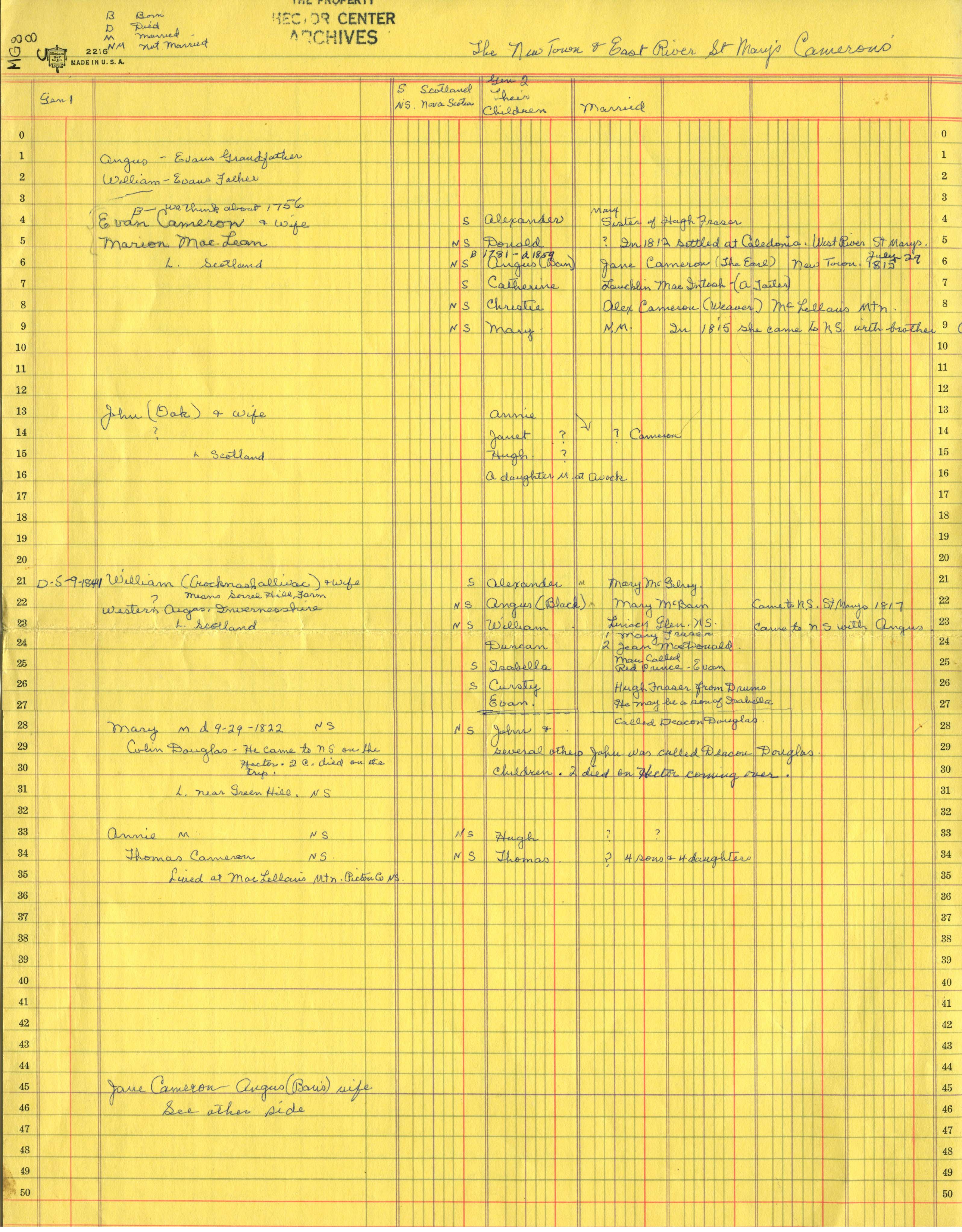 Genealogy of Evan Cameron and his wife Marion MacLean. Consists of three pages.