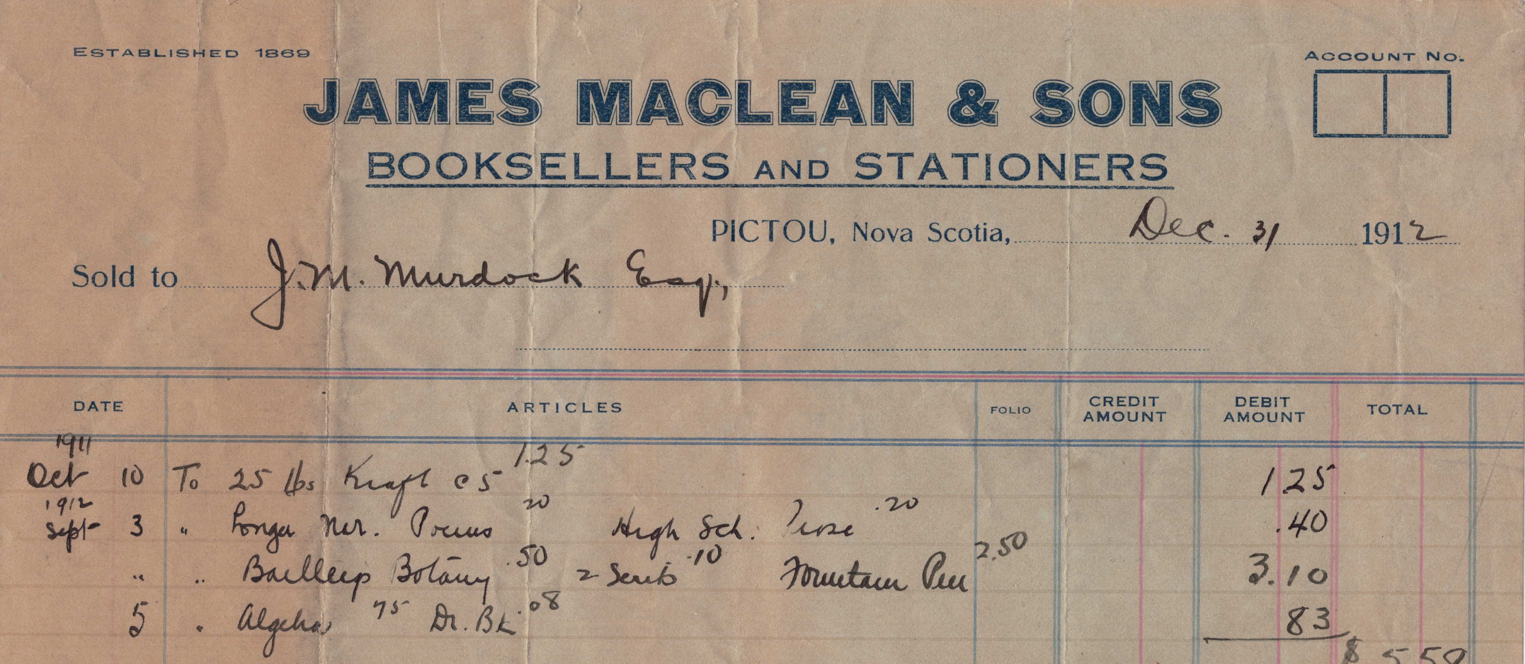 | Tags: | invoice, James MacLean, James MacLean & Sons, booksellers, J.M. Murdock, John Murdock, Pictou |