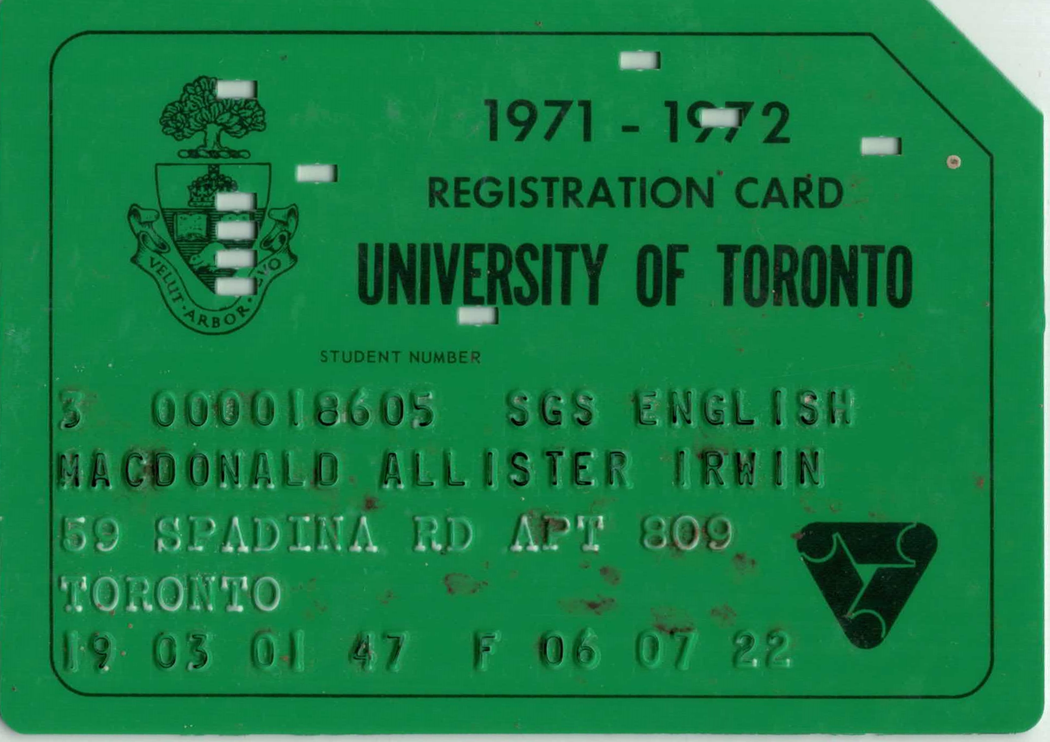 | Tags: | University of Toronto, Allister I. MacDonald, Allister MacDonald Fonds, student card, card, Toronto |