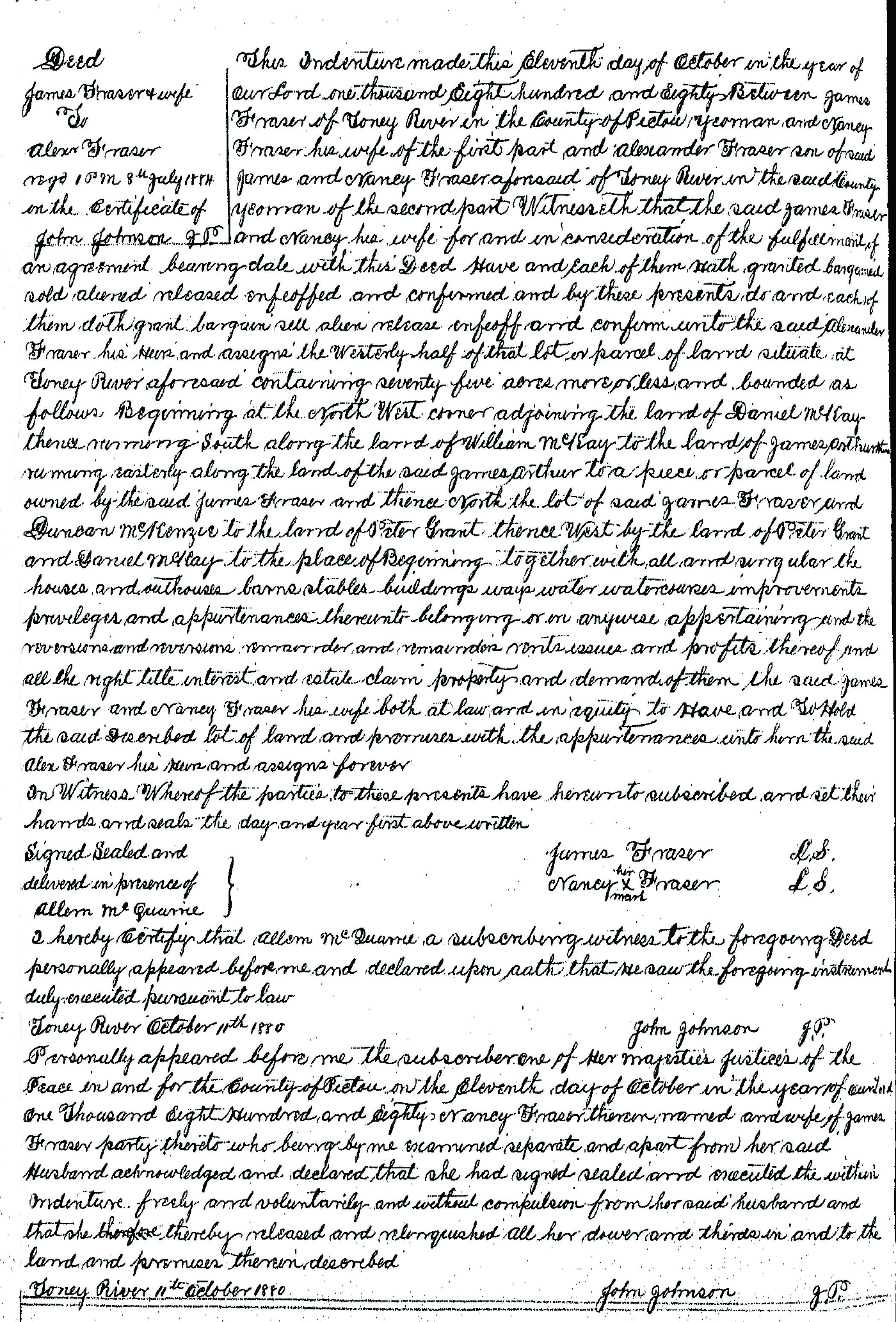 Alexander "Alex" Fraser and his younger brother Simon Roderick Fraser were deeded the Fraser family farm at Toney River on October 11, 1880 - just three weeks before the death of their father James Fraser who died on November 3, 1880. Therefore, their father's death must have been expected. The agreement was witnessed and registered by Allan McQuarrie, the uncle of Alex and Simon Fraser, who lived nearby. Allan was married to Christina McRae, the sister of Nancy Ann (McRae) Fraser.