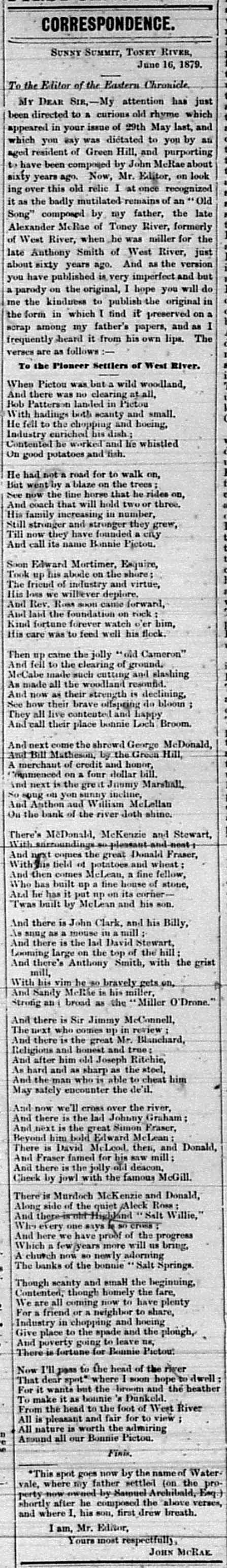 This song written by Alexander McRae and the letter to the editor written by his son John McRae dated June 16, 1879 were both submitted to the Eastern Chronicle in response to a version of the song was submitted to the Eastern Chronicle from memory by a resident of Green Hill and published on May 29, 1879. This letter and this correct and original version of the song were published in the July 10 edition of the Eastern Chronicle.