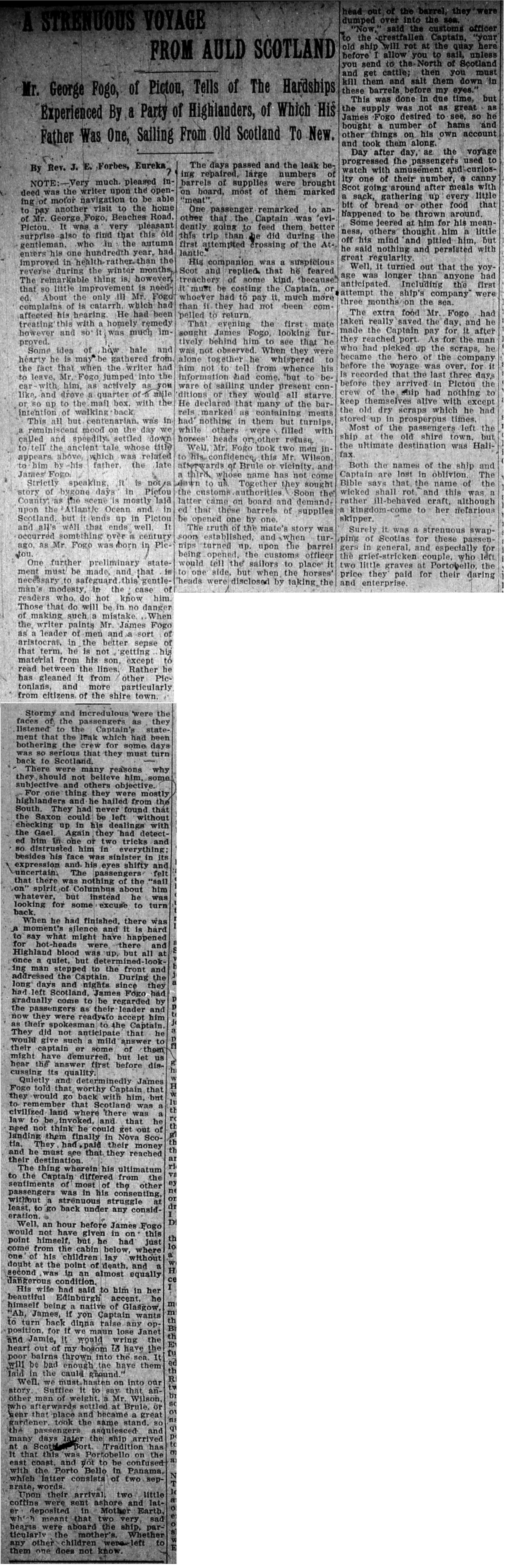 Mr. George Fogo, of Pictou, Tells the Hardships Experienced by a Party of Highlanders, of Which His Father Was One, Sailing From Old Scotland to New.