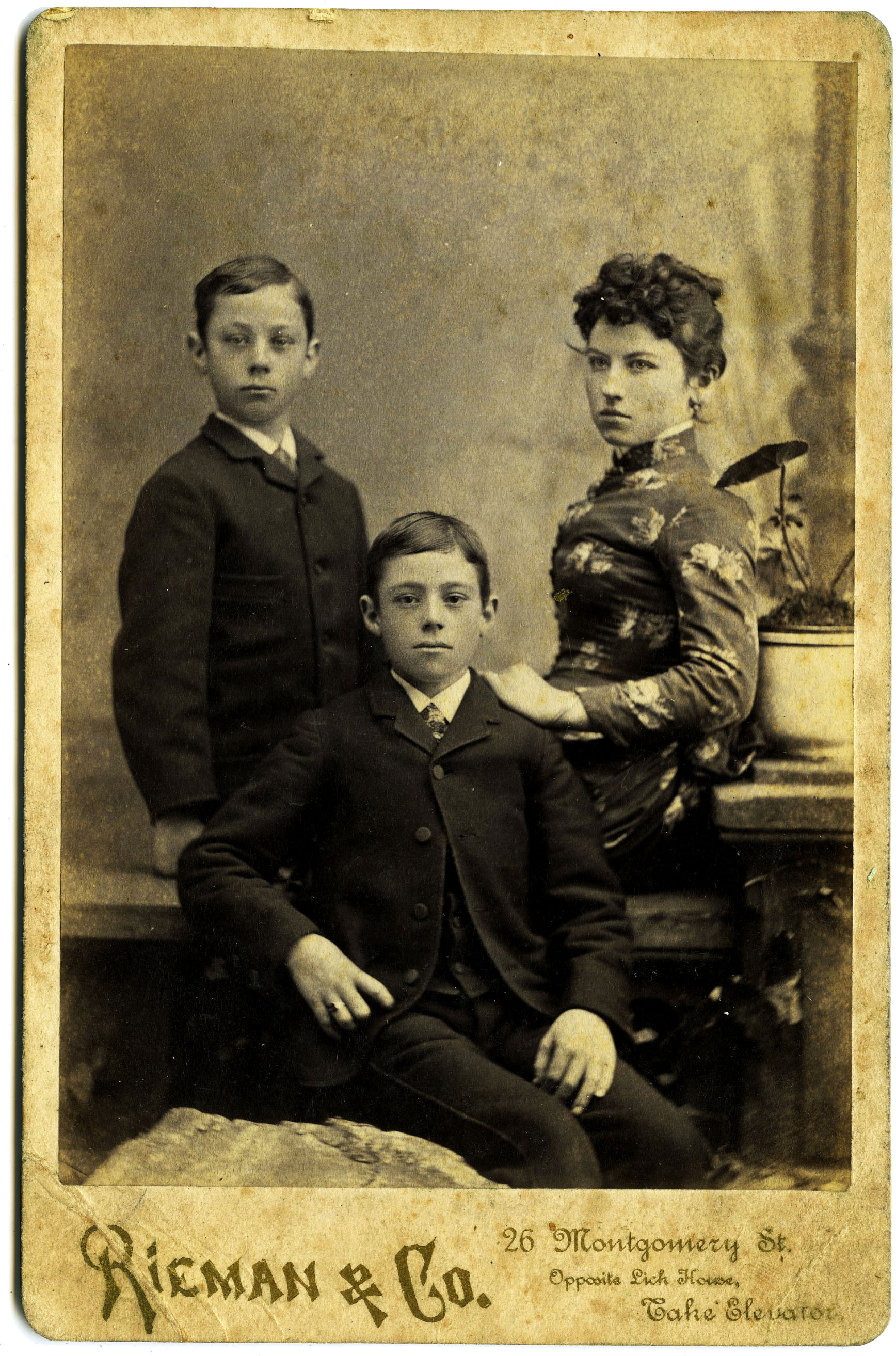 Pictured are (standing) David A "Dave" McMinn born about 1874, Charles H "Charley" McMinn born about 1870 and Elizabeth Janette "Lizzie" McMinn born about 1867. These three of Alexander and Margaret's children were born in Providence, Rhode Island.