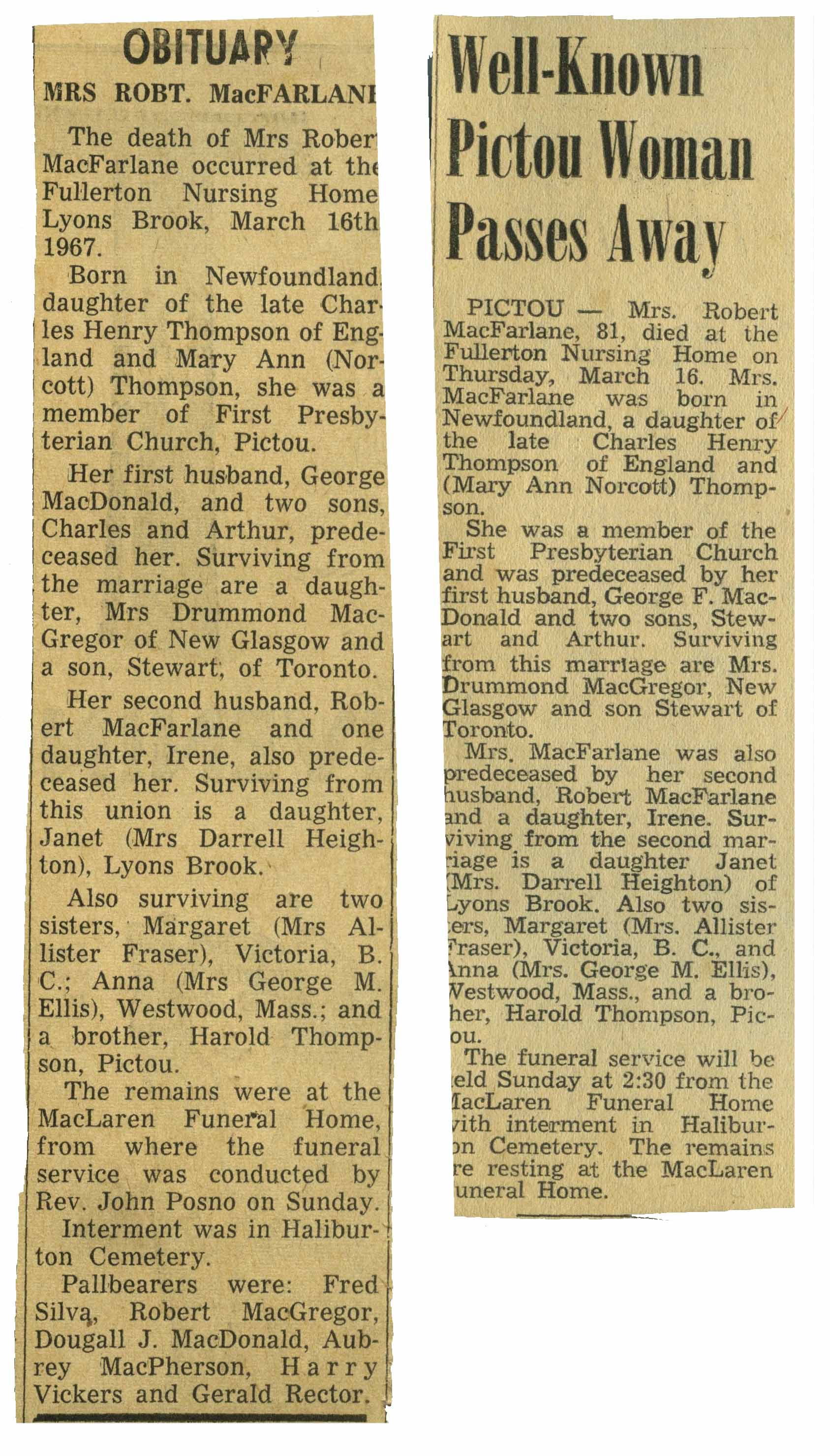 Abbie Francis Thompson McDonald MacFarlane death notice printed in newspaper.