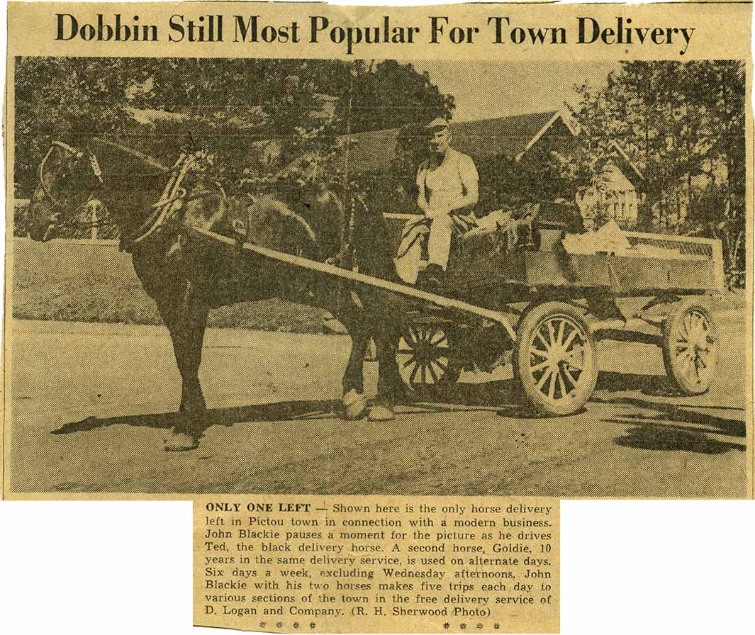 Only One Left - Shown here is the only horse delivery left in Pictou town in connection with a modern business. John Blackie pauses a moment for the picture as he drives Ted, the black delivery horse. Goldie, 10 years in the same delivery service, is used on alternate days. Six days a week, excluding Wednesday afternoons, John Blackie with his two horses makes five trips each day to various sections of the town in the free delivery service of D. Logan and Company. (R. H. Sherwood Photo)