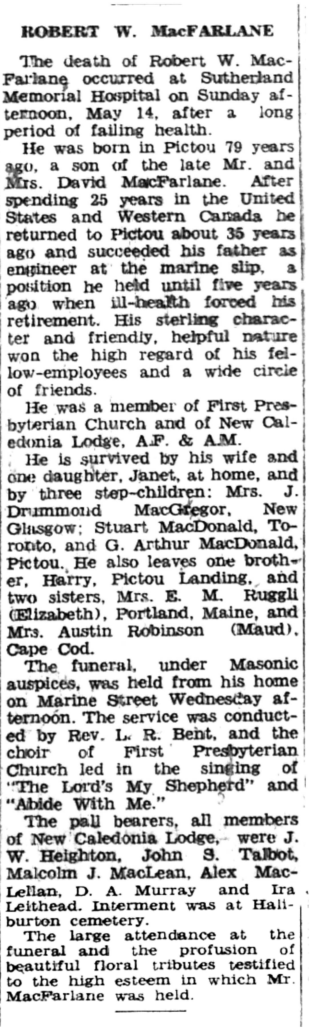 He was born in Pictou 79 years ago, a son of the late Mr. and Mrs. David MacFarlane. After spending 25 years in the United States and Western Canad he returned to Pictou about 35 years ago and succeeded his father as engineer at the marine slip, a position he held until five years ago when ill-health forced his retirement. His sterling charachter and friendly, helpful nature won the high regard of his fellow-employees and a wide circle of friends.