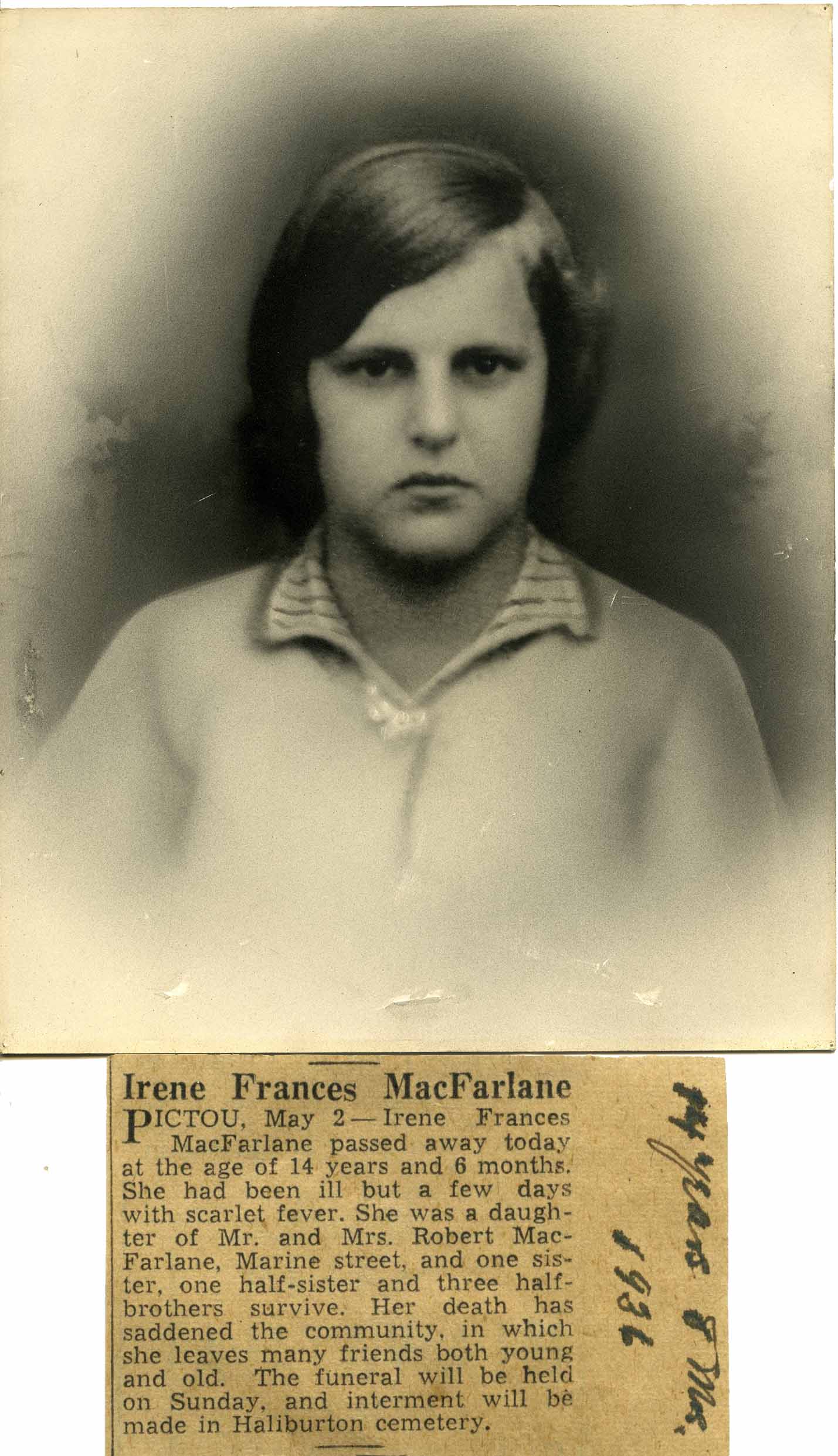 Pictou, May 2 - Irene Frances MacFarlane passed away today at the age of 14 years and 6 months. She had been ill but a few days with scarlet fever. She was a daughter of Mr. and Mrs. Robert MacFarlane, Marine street, and one sister, one half-sister and three half-brothers survive. Her death has saddened the community, in which she leaves many friends both young and old. The funeral will be held on Sunday, and interment will be made in Haliburton cemetery.