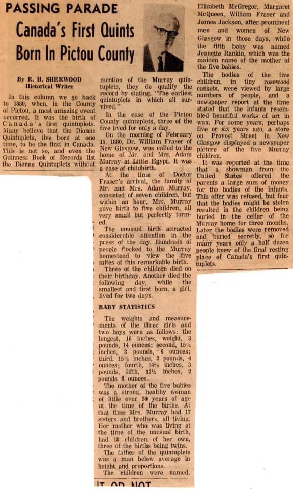 In this column we go back to 1880, when in the County of Pictou, a most amazing event occurred. It was the birth of Canada’s first quintuplets. Many believe that the Dionne Quintuplets, five born at once time, to be the first in Canada. This is not so, and even the Guinness Book of Records list the Dionne Quintuplets without mention of the Murray quintuplets, they do qualify the record by stating, “The earliest quintuplets in which all survived.”