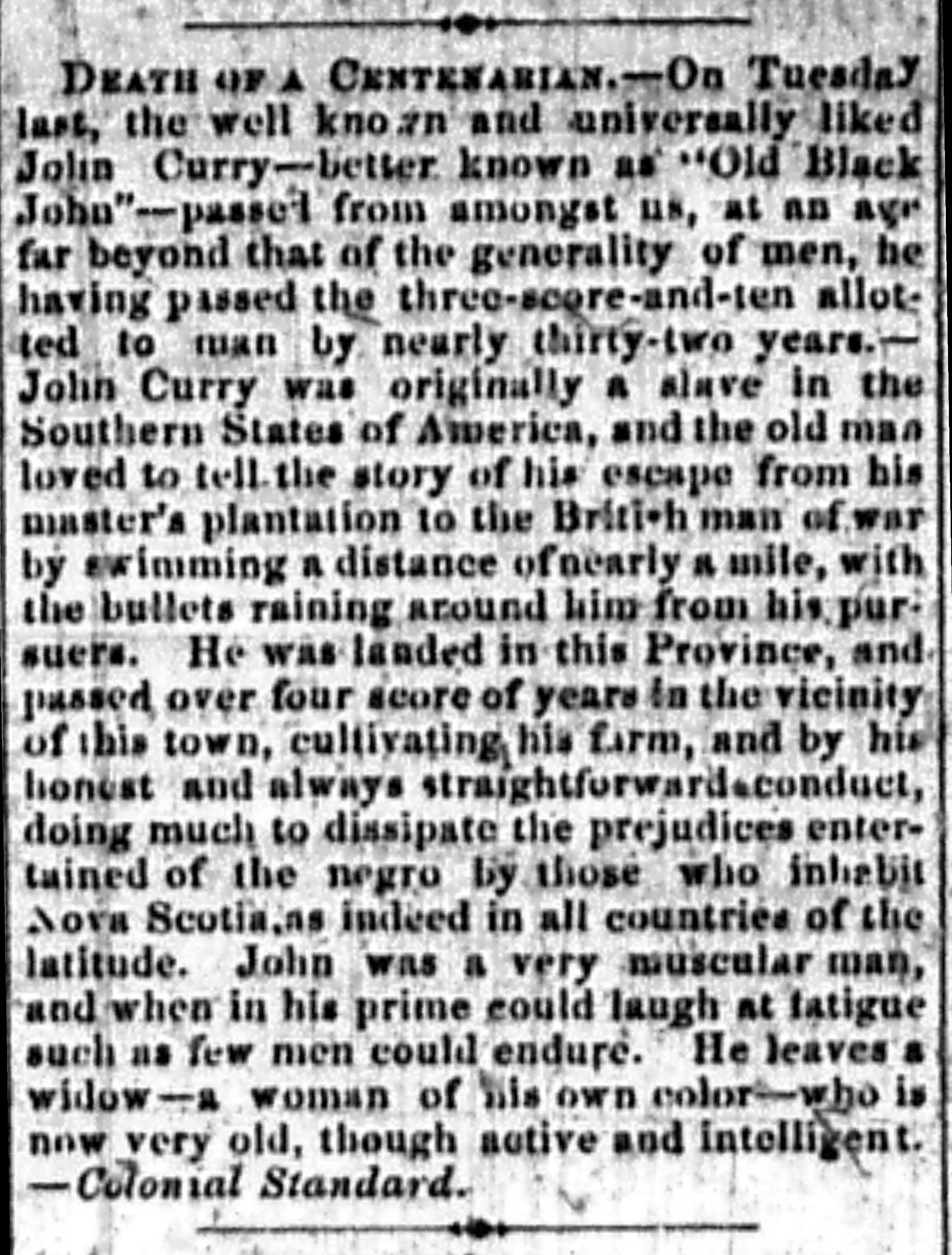 Death Of A Centenarian - On Tuesday last, the well known and universally liked John Curry - better known as "Old Black John" - passed from amongst us, at an age far beyond that of the generality of men, he having passed the three-score-and-ten alloted to man by nearly thirty-two years. - John Curry was originally a slave in the Southern States of America, and the old man loved to tell the story of his escape from his master's plantation to the British man of war by swimming a distance of nearly a mile, with the bullets raining around him from his pursuers. He was landed in this Province, and passed over four score of years in the vicinity of this town, cultivating his farm, and by his honest and always straightforward conduct, doing much to dissipate the prejudices entertained of the negro by those who inhabit Nova Scotia, as indeed in all countries of the latitude. John was a very muscular man, and when in his prime could laugh at fatigue such as few men could endure. He leaves a widow - a woman of his own color - who is now very old, though active and intelligent. - Colonial Standard.