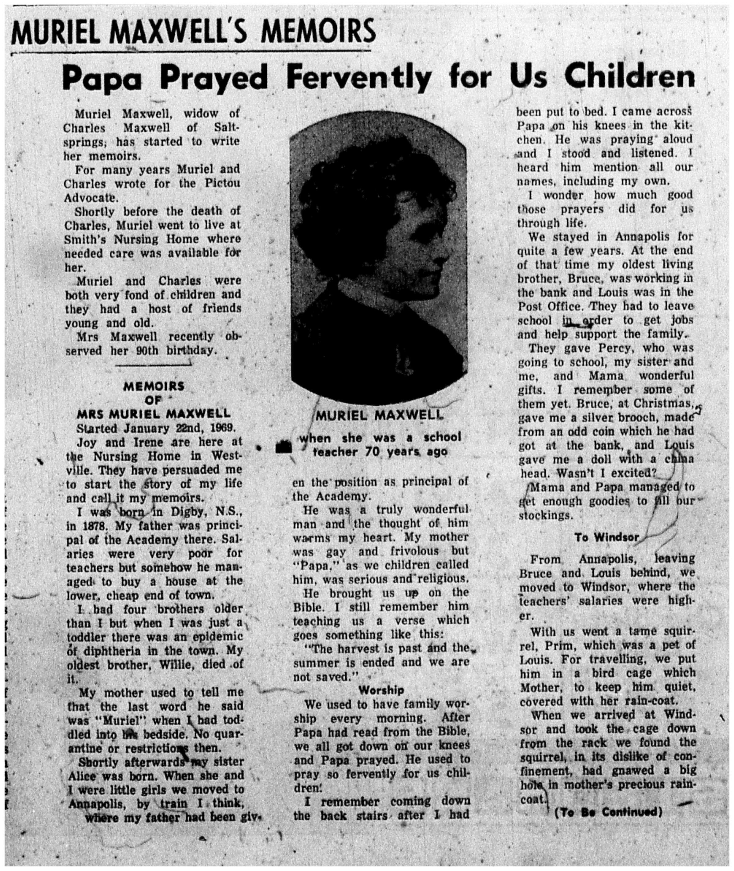 | Tags: | Charles Maxwell, Salt Springs, Digby, Annapolis, Windsor, Hants County, Pictou County, teacher, Mount Thom, Alexander MacRae, Eliza Anderson MacRae Maxwell, Muriel MacRae Maxwell |
