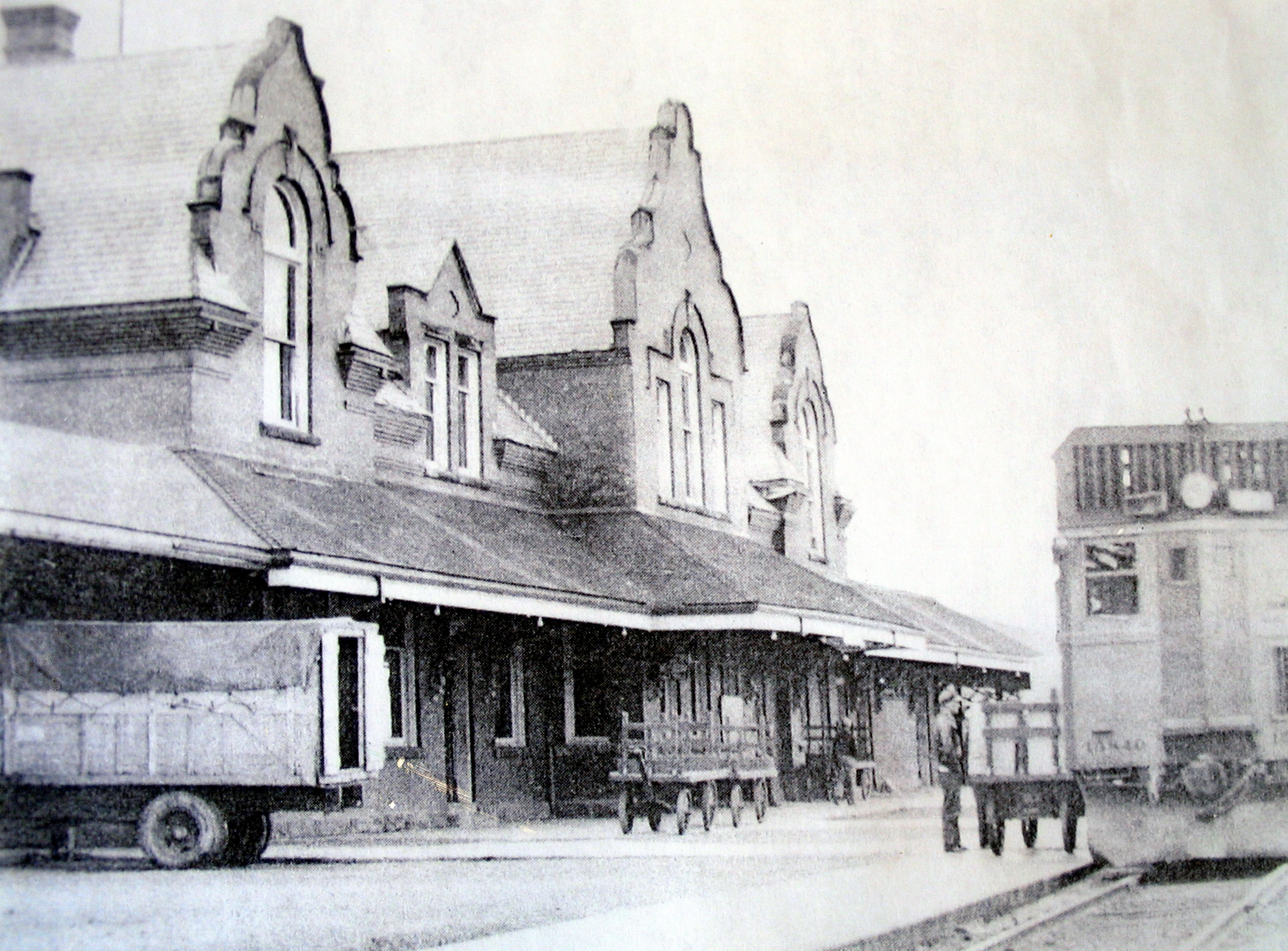 The Canadian National train station in Pictou, built in 1904, with the 'Jitney' train at the station. The Jitney ran on the Short Line between Pictou and Oxford Junction. On the left is a truck from the CN Express freight operations.