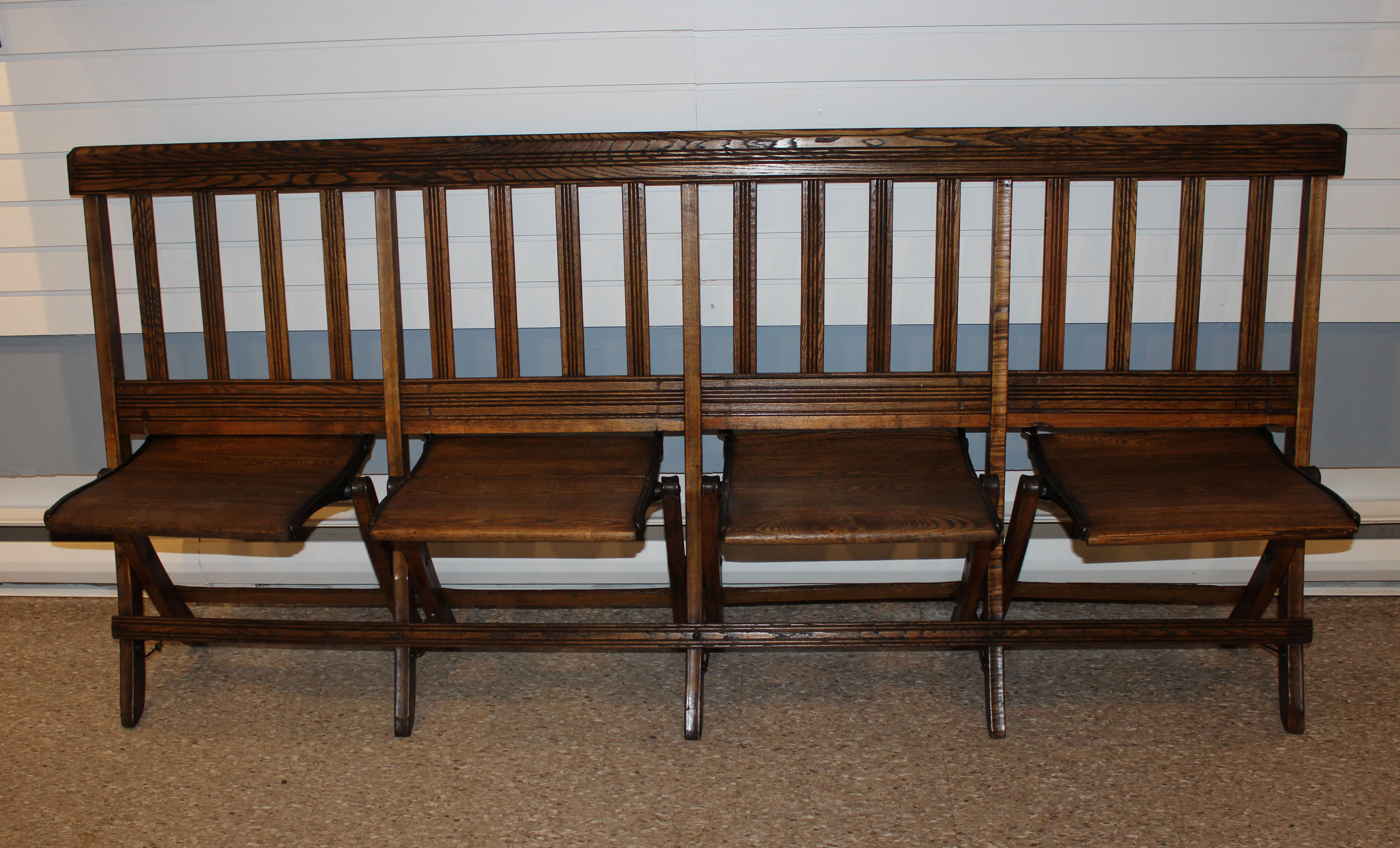 It has four separate seats that connect to one back rest. Each seat can flip up indendently when not in use.