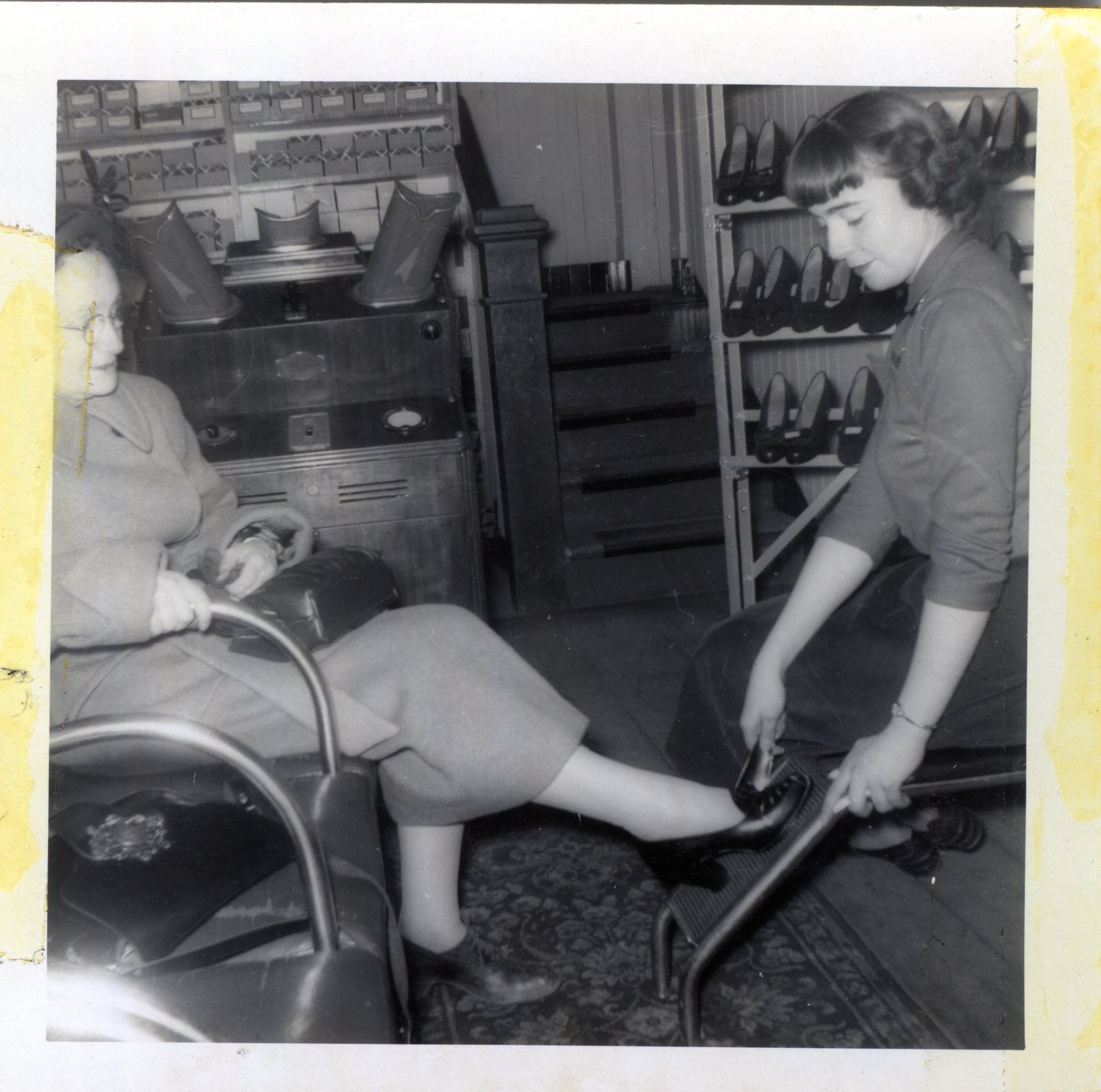 A sales associate helping a woman at MacKinnon's Shoe Store on Water Street, about 1950s. In the back on the left is the Kray X-ray machine for fitting shoes.