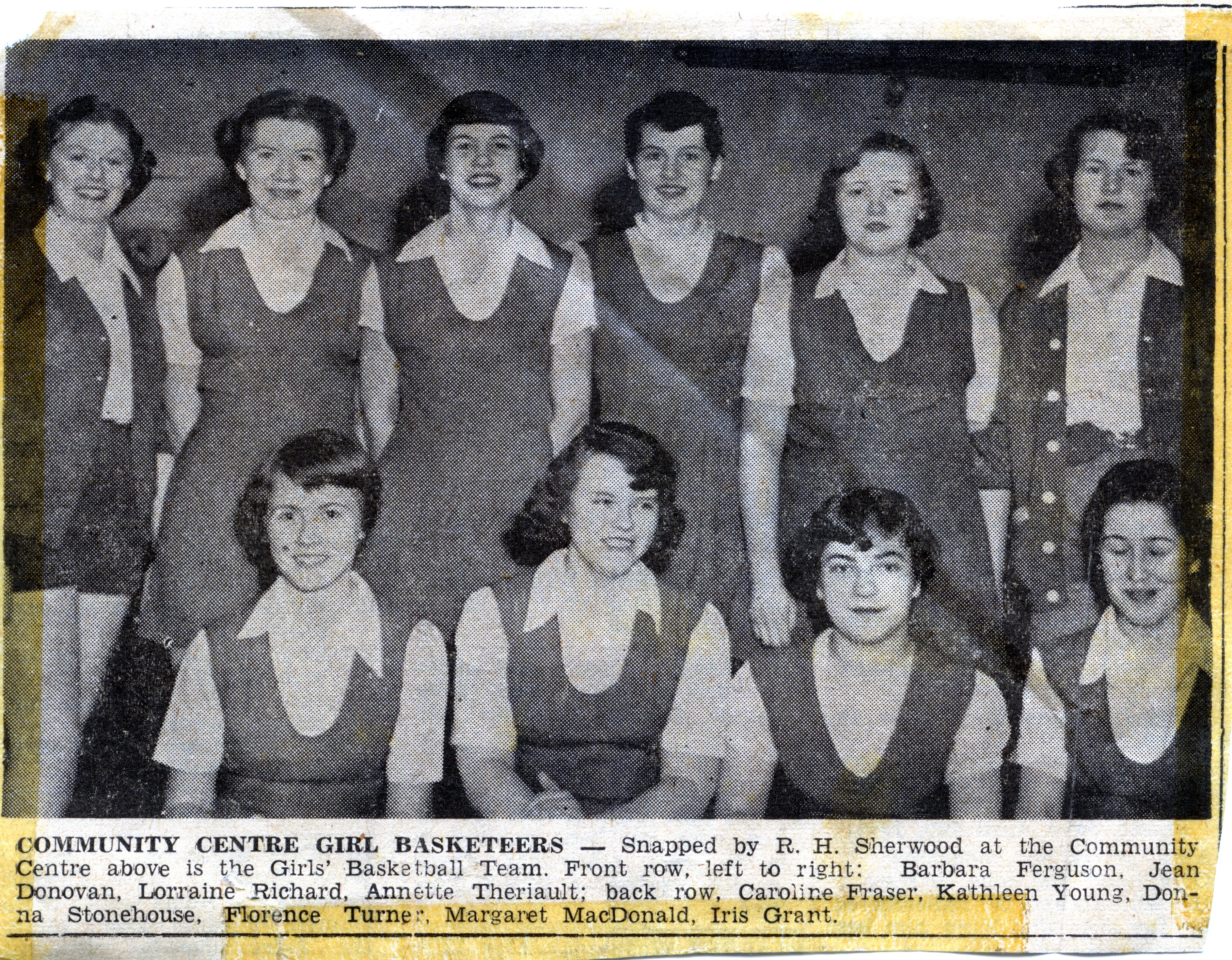Newspaper article featuring a photo by R.H. Sherwood of Pictou's Community Centre Girls Basketeers. Front, l to r: Barbara Ferguson, Jean Donovan, Lorraine Richard, Annette Theriault. Back, l to r: Caroline Fraser, Kathleen Young, Donna Stonehouse, Florence Turner, Margaret MacDonald, Iris Grant.