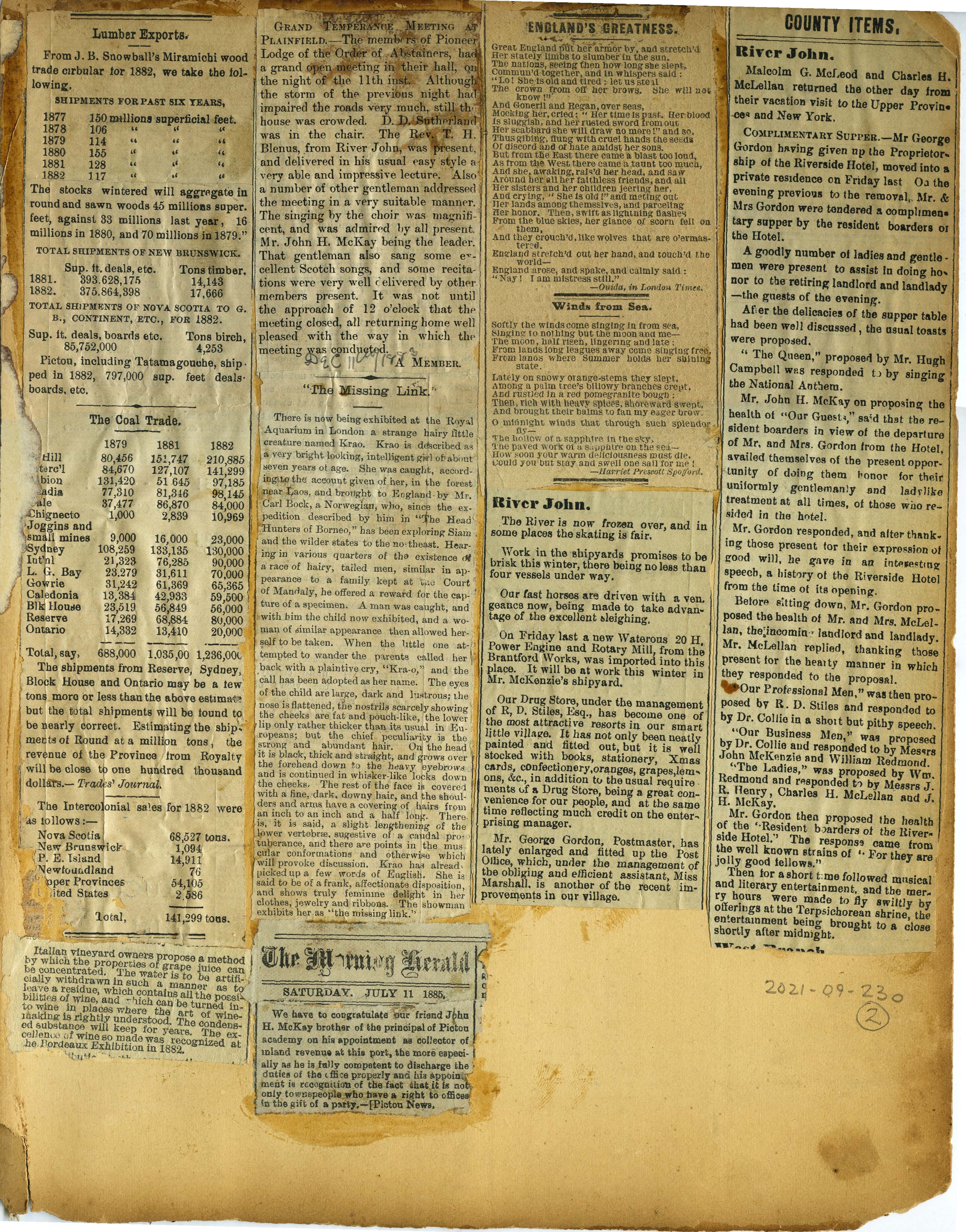 | Tags: | lumber trade, coal exports, Italian vineyards concentrating grape juice, D D Sutherland, Rev T H Blenus, River John community notes, McKenzie shipyard, R D Stiles, George Gordon, Miss Marshall, Malcolm G McLeod, Charles H McLellan, Hugh Campbell, Dr Collie, John McKenzie, William Redmond, J R Henry, Riverside Hotel |