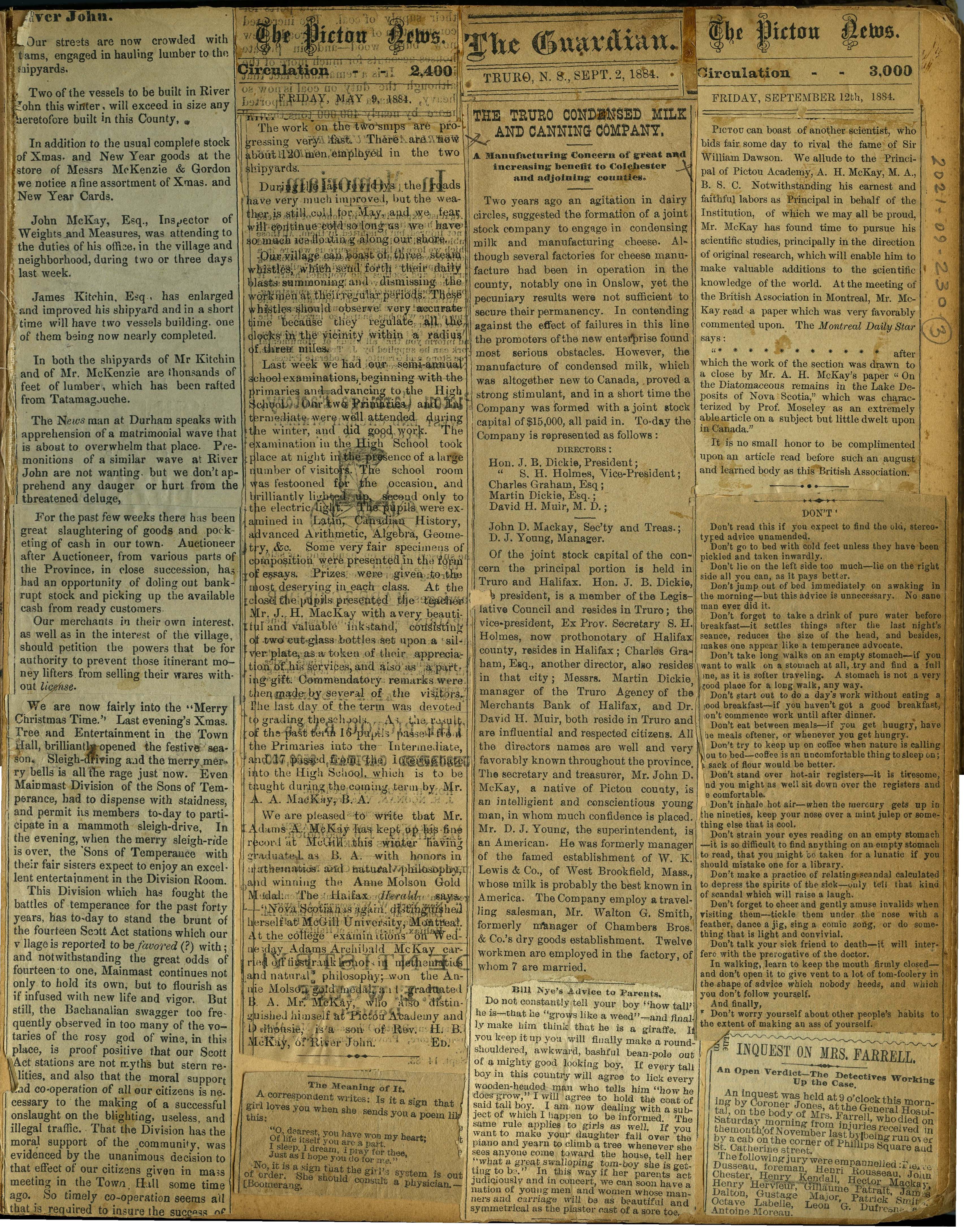 | Tags: | John McKay Inspector of Weights and Measures, James Kitchin, McKenzie shipyard, Kitchin shipyard, Durham newsman, Sons of Temperance, McGill University, Adams Archibald McKay, Rev H B McKay River John, condensed milk, A H McKay, Mrs Farrell |