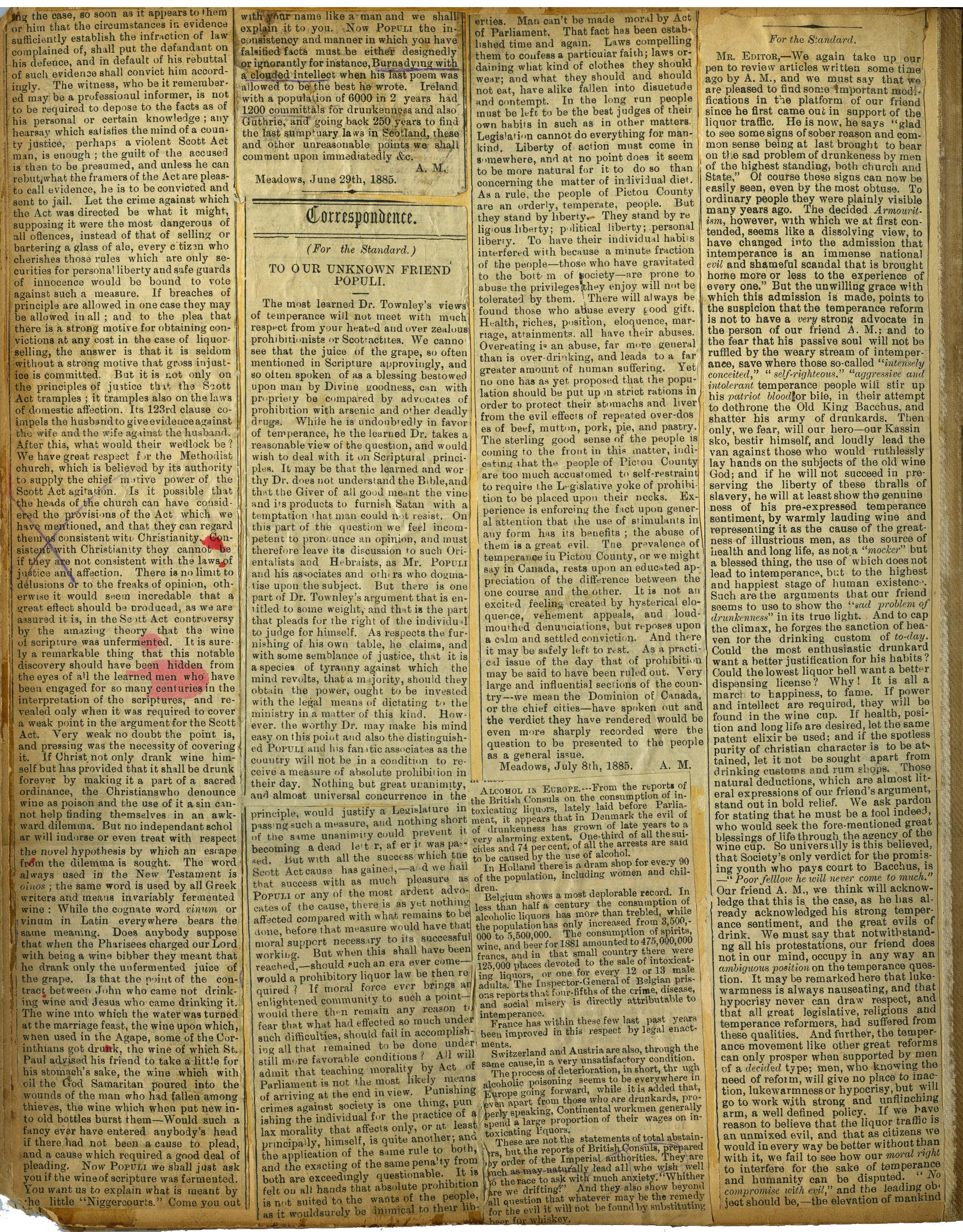 Letters to the editor of the Colonial Standard, inlcuding conclusion of letter from A M dated Meadows, 29 June, 1885 and 8 July 1885. As well the first part of letter from Populi dated River John, 1 September 1885.
