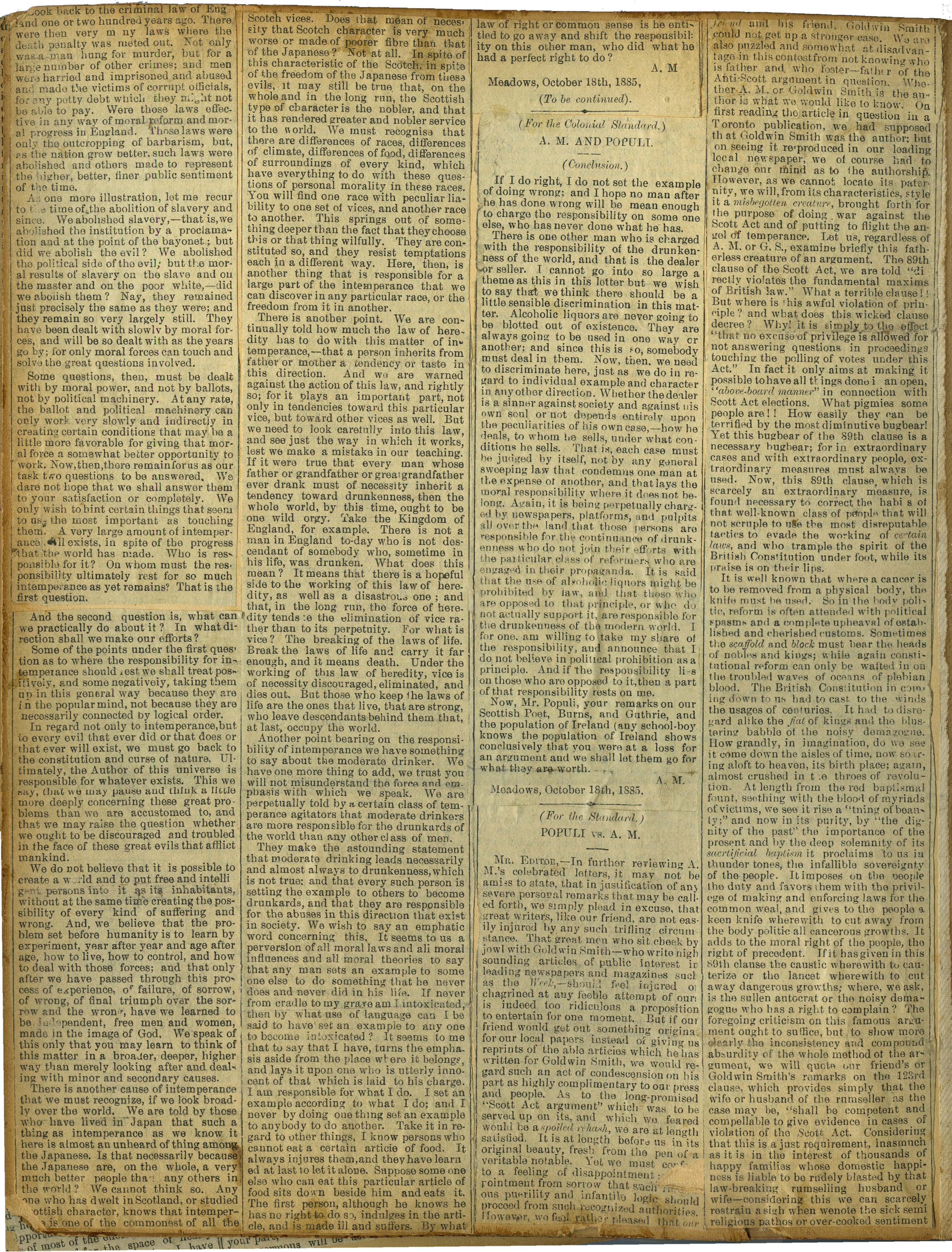Conclusion of letter to the editor of the Colonial Standard by AM dated Meadows, 18 October 1885 and first part of letter from Populi dated River John, 20 October 1885.