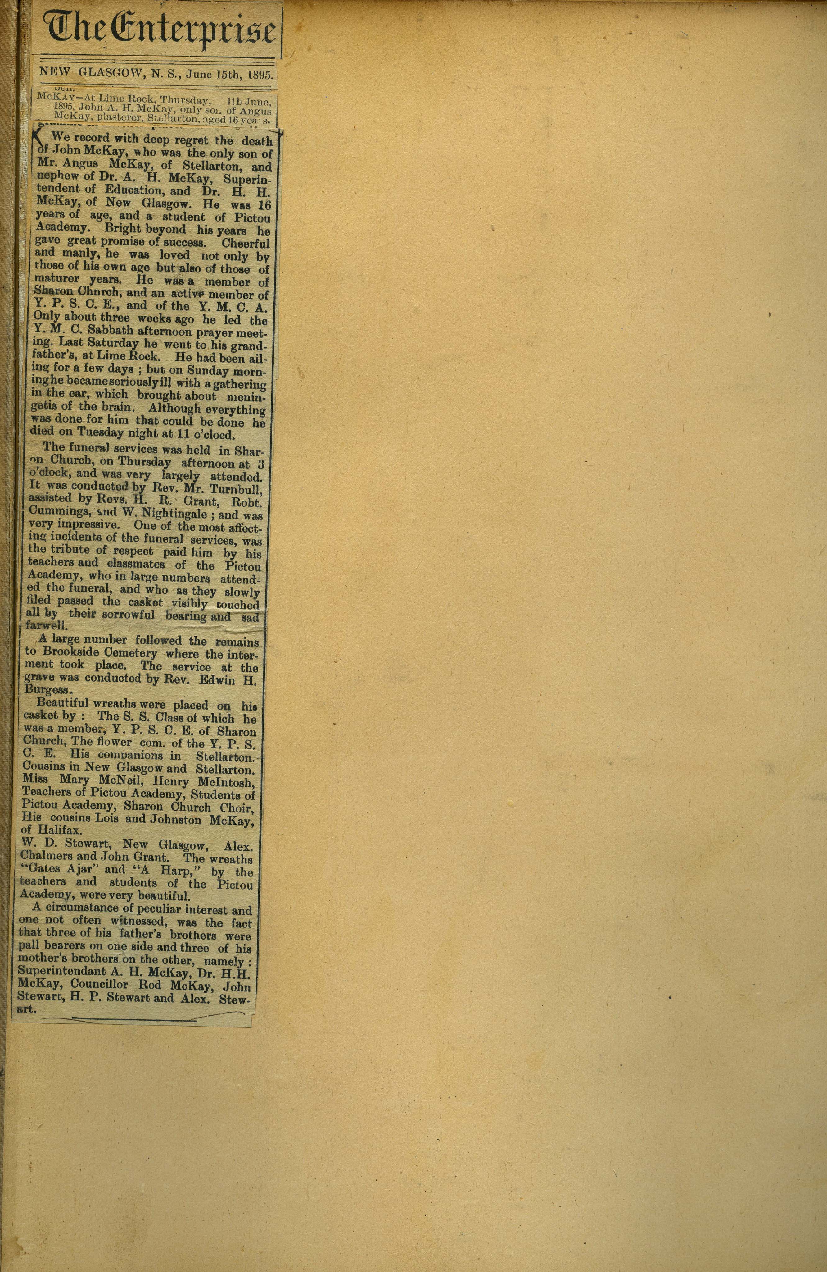 News article printed in The Enterprise, New Glasgow, 15 June 1895 regarding the death of John A H McKay, age 16, only son of Angus McKay, plasterer, Stellarton and a more lengthy obituary.