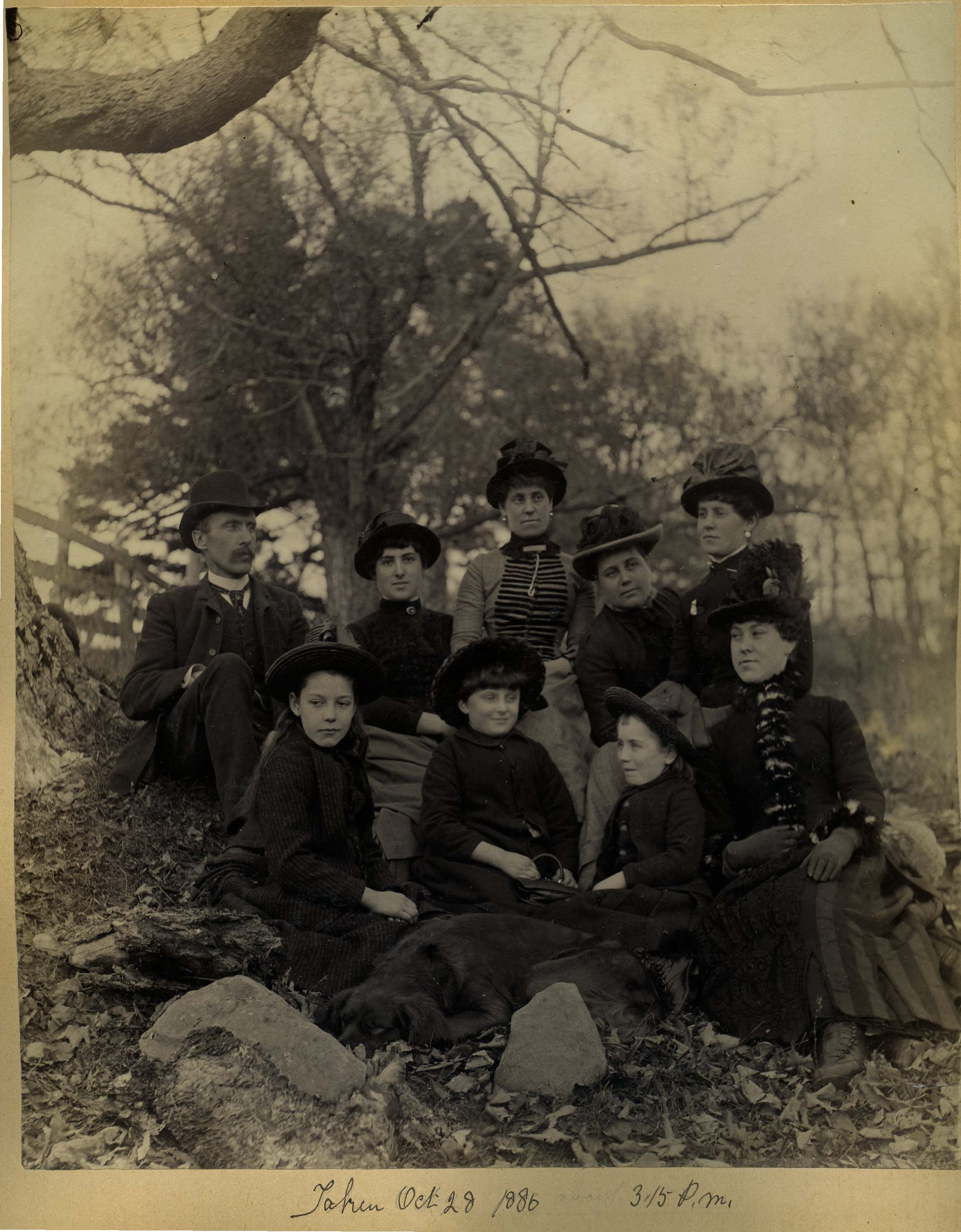 Unidentifed photo group of five women, one man, three girls and a dog, dated 28 October 1886 3.15 p.m.