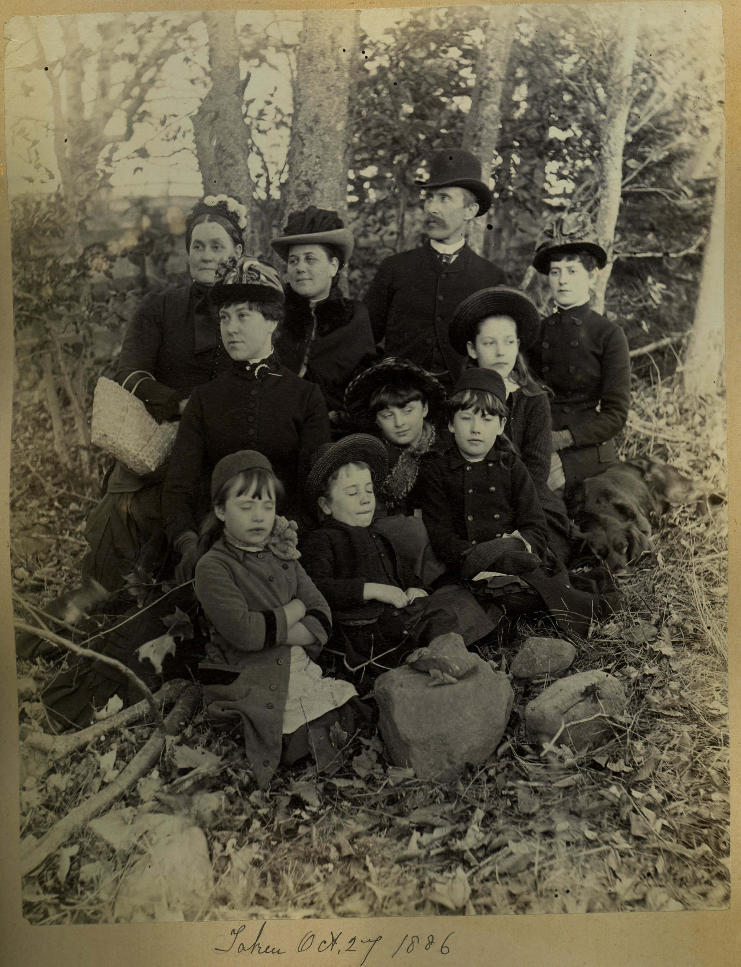 Unidentifed photo of group of four women, one man, five girls and a dog dated 27 October 1886.