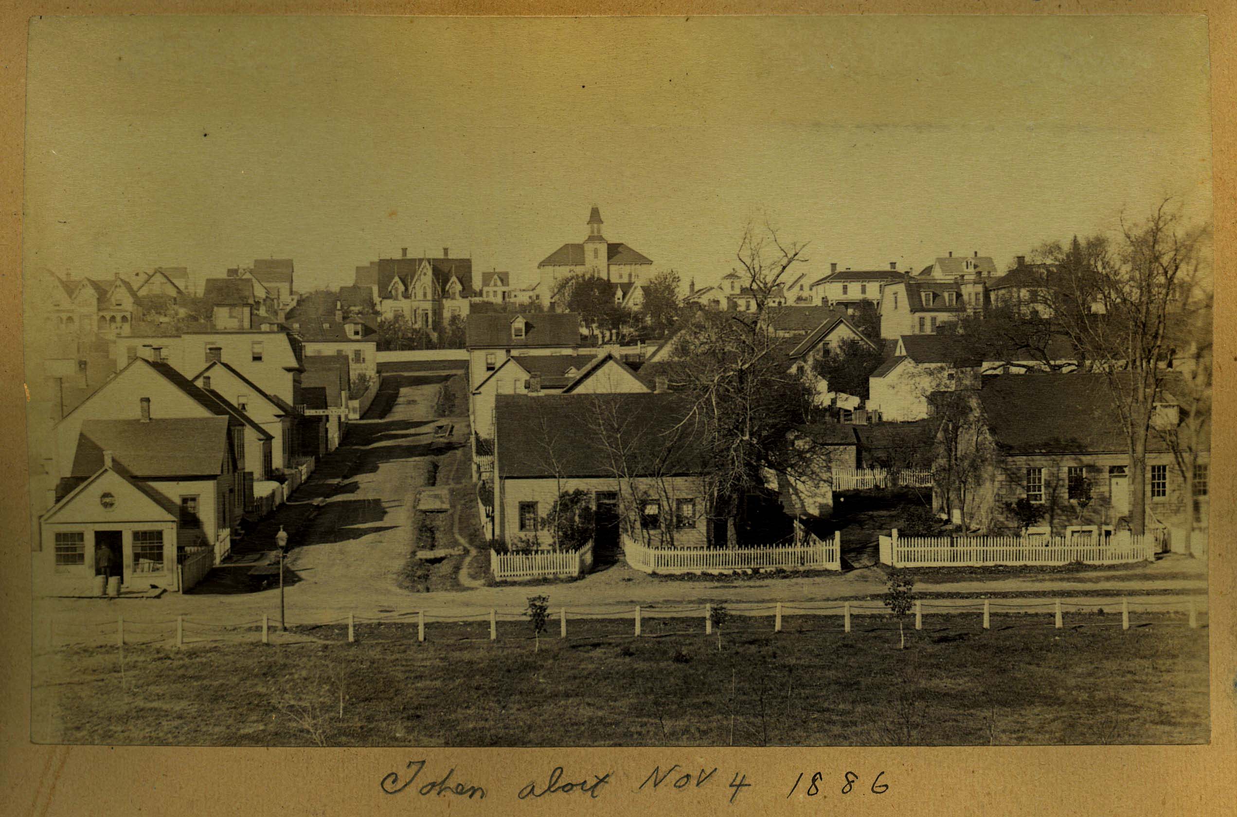 Photo taken about 4 November 1886 of mid Front Street, Pictou showing the Meagher and Blackadar homes, homes along Chapel and Denoon Street as well as the East End School on the horizon.