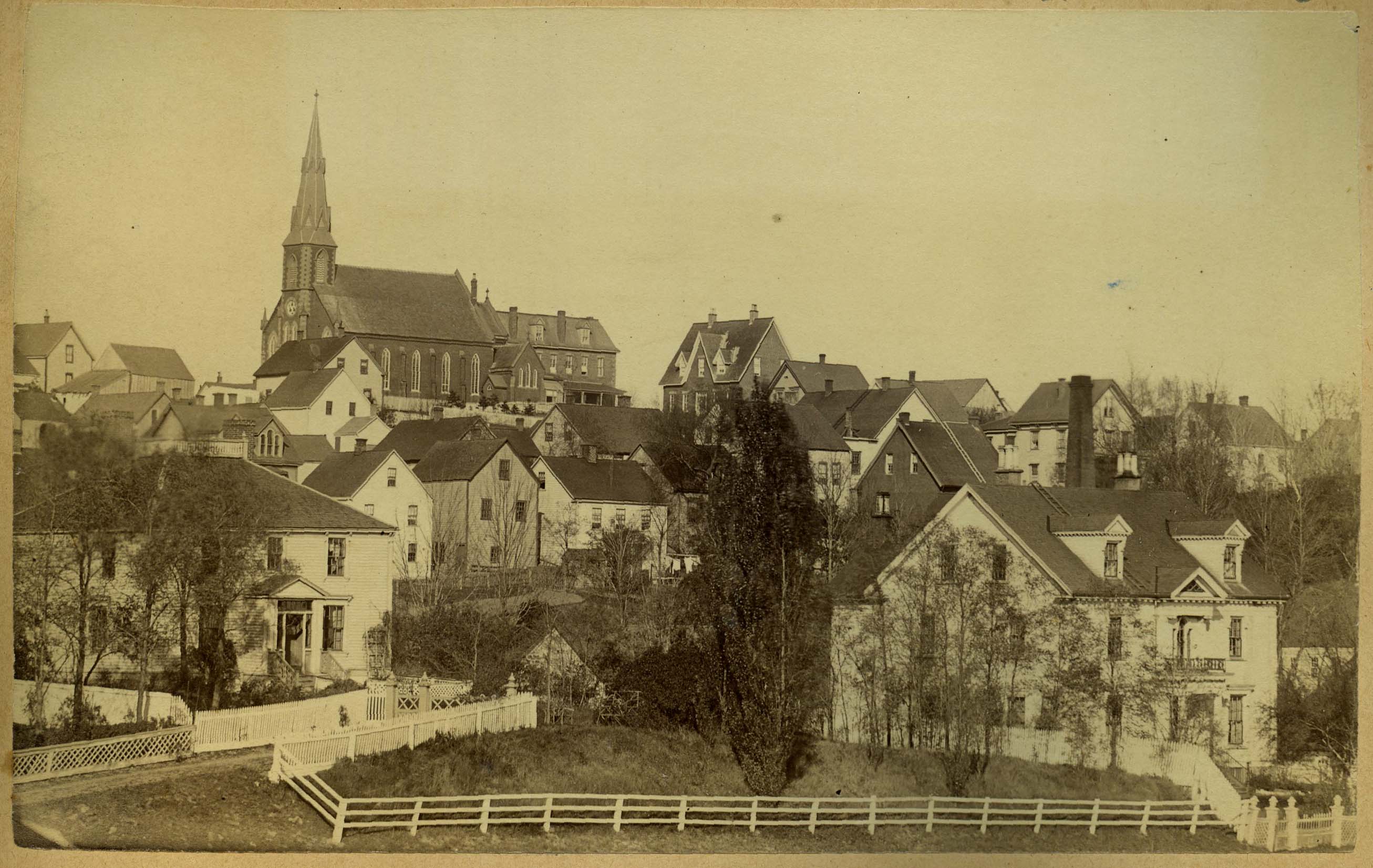 View of Front Street, Pictou showing the Davies house, Tobin house, Stella Maris Catholic Church and manse in the background and surrounding buildings along St. Stephen Street, St. Andrews Street, etc.