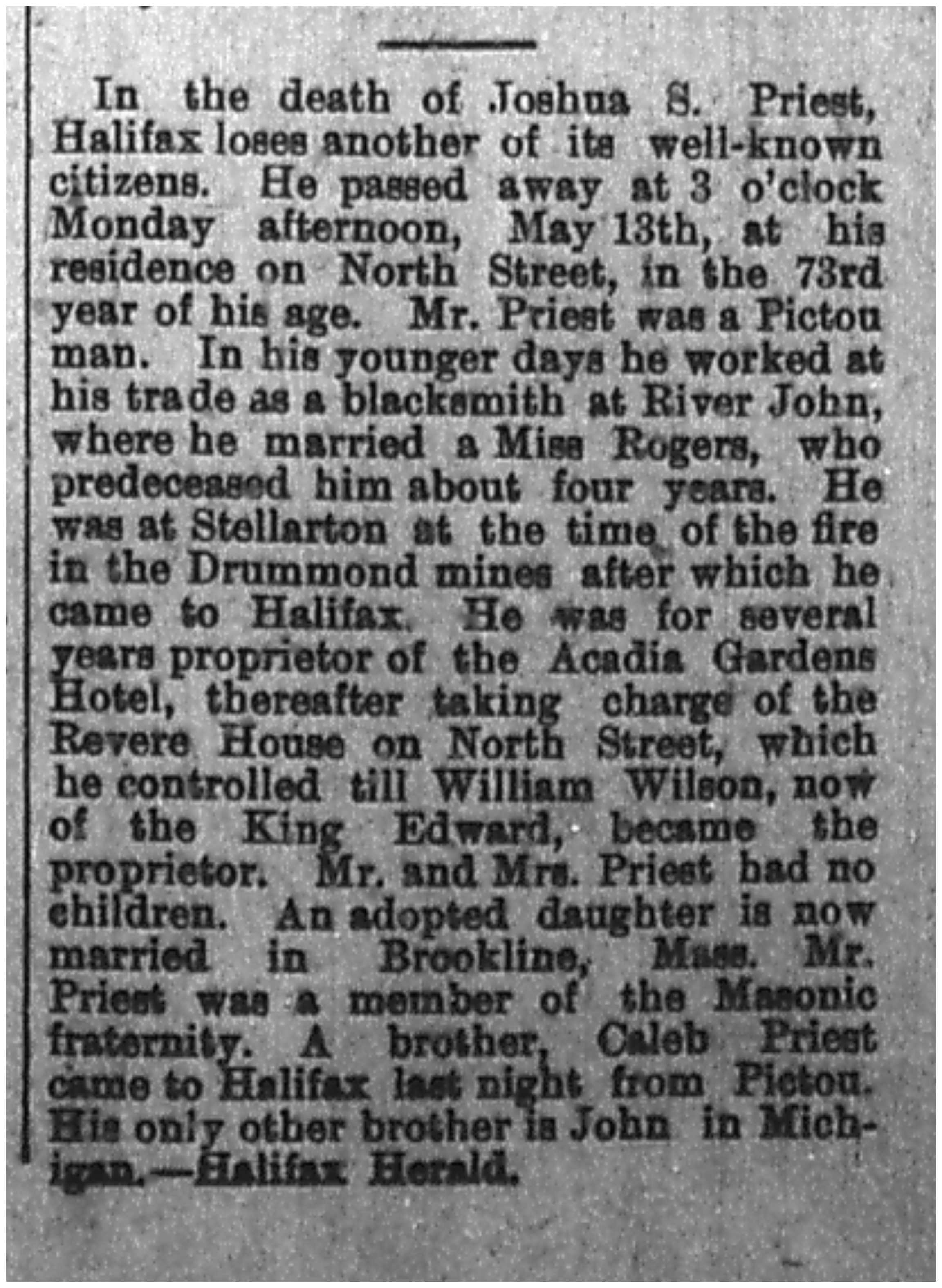 In the death of Joshua S. Priest, Halifax loses another of its well-known citizens. He passed away at 3 o'clock Monday afternoon, May 13th, at his residence on North Street, in the 73rd year of his age. Mr. Priest was a Pictou man. In his younger days he worked at his trade as a blacksmith at River John, where he married a Miss Rogers, who predeceased him about four years ago. He was at Stellarton at the time of the fire in the Drummond mines after whichh he came to Halifax. He was for several years proprietor of the Acadia Gardens Hotel, thereafter taking charge of the Revere House on North Street, which he controlled till William Wilson, now of the King Edward, became the proprietor. Mr. and Mrs. Priest had no children. An adopted daughter is now married in Brookline, Mass. Mr. Priest was a member of the Masonic fraternity. A brother, Caleb Priest came to Halifax last night from Pictou. His only other brother is John in Michigan. - Halifax Herald.