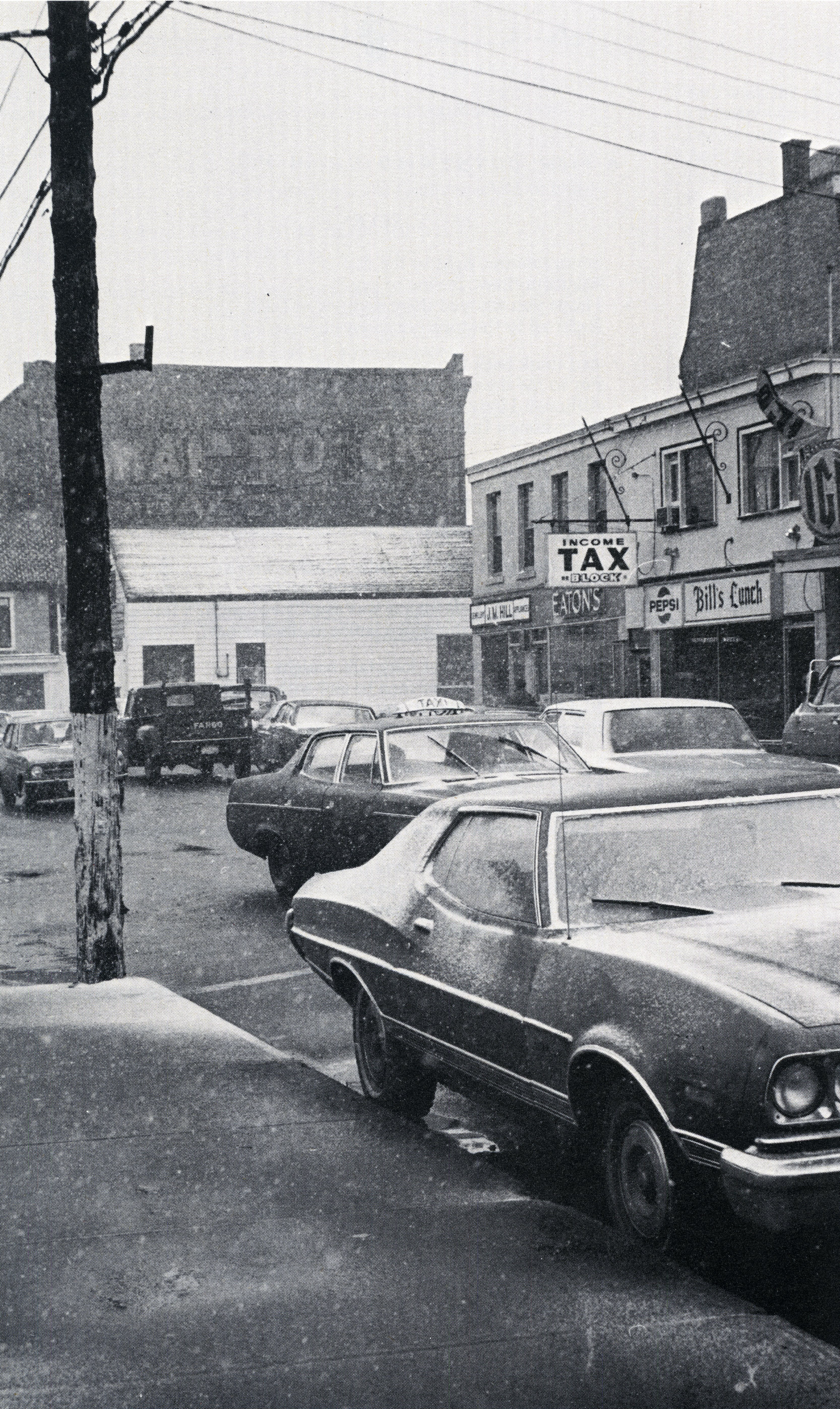 Photo of downtown Pictou (Front Street) in 1973 from the 1972-1973 Pictou Academy Yearbook. Photo includes J.M. Hill, Eatons, Tax Block, Bill's Lunch, and the IGA. Sides of the Scotiabank and pharmacy are visible.