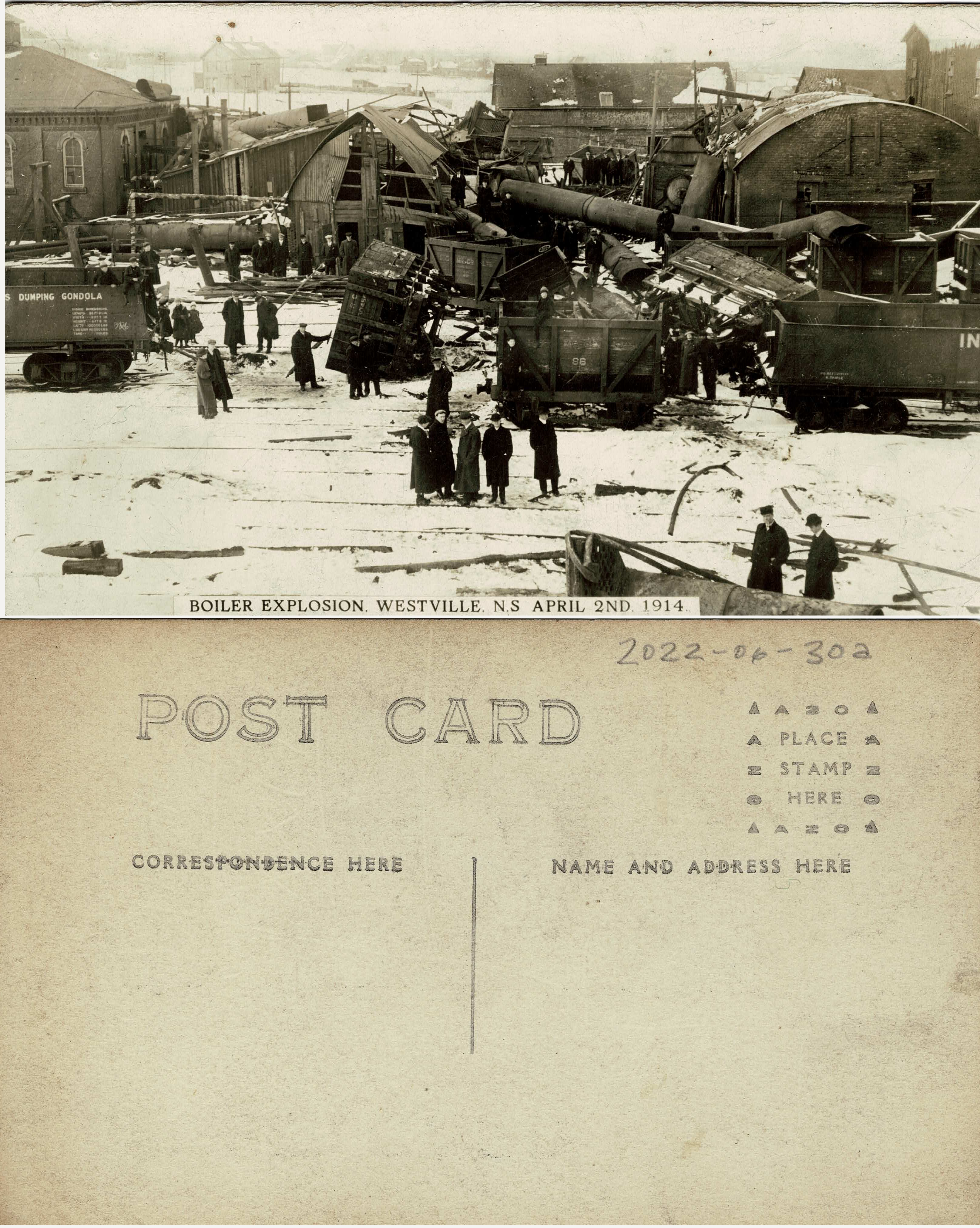 Postcard of the boiler explosion at the Drummond Mine in Westville. Occuring in April 1914, the boiler within the boiler shed exploded and killed five men.