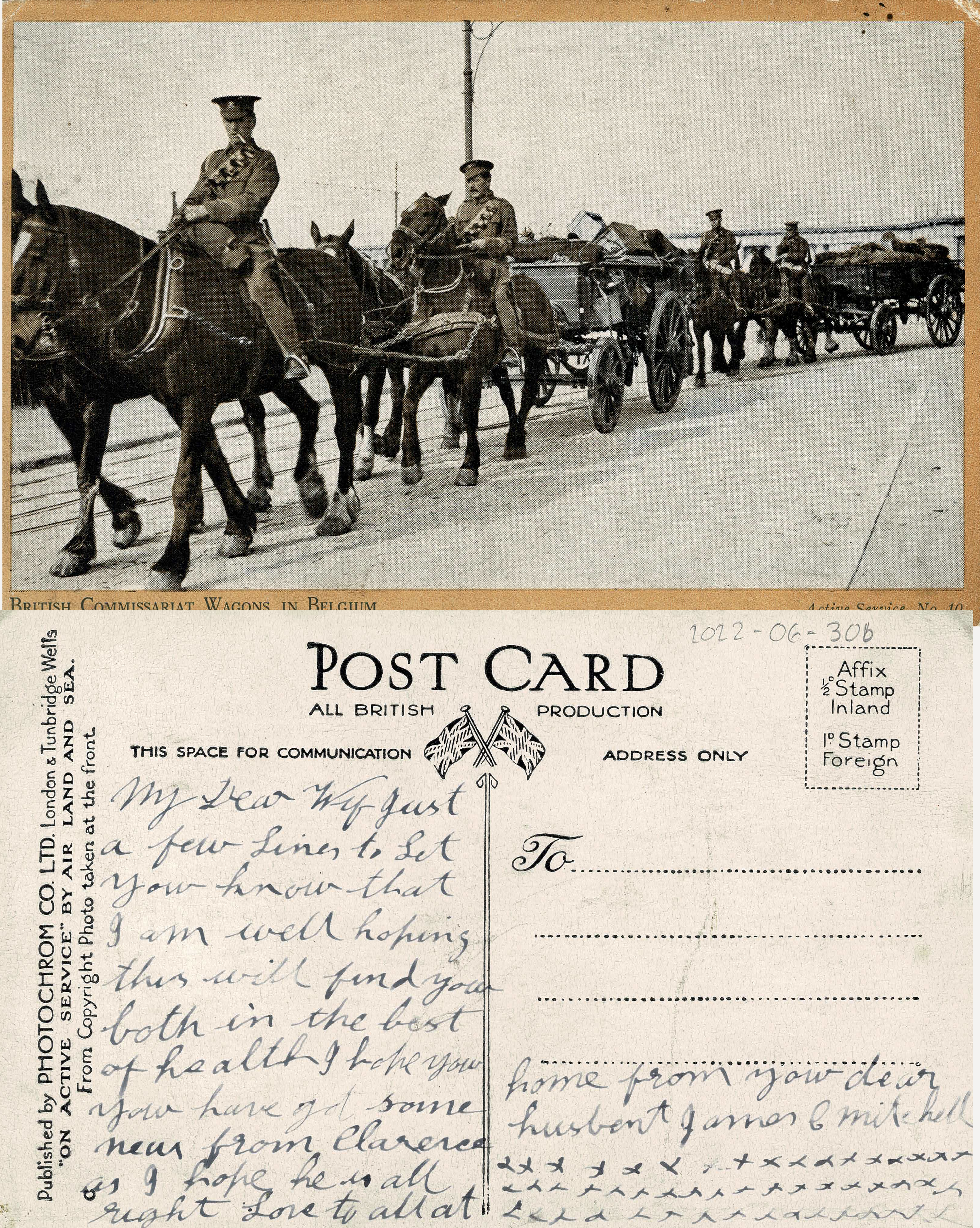 British Commissariat Wagons in Belgium postcard sent from James C. Mitchell to his wife Janet.