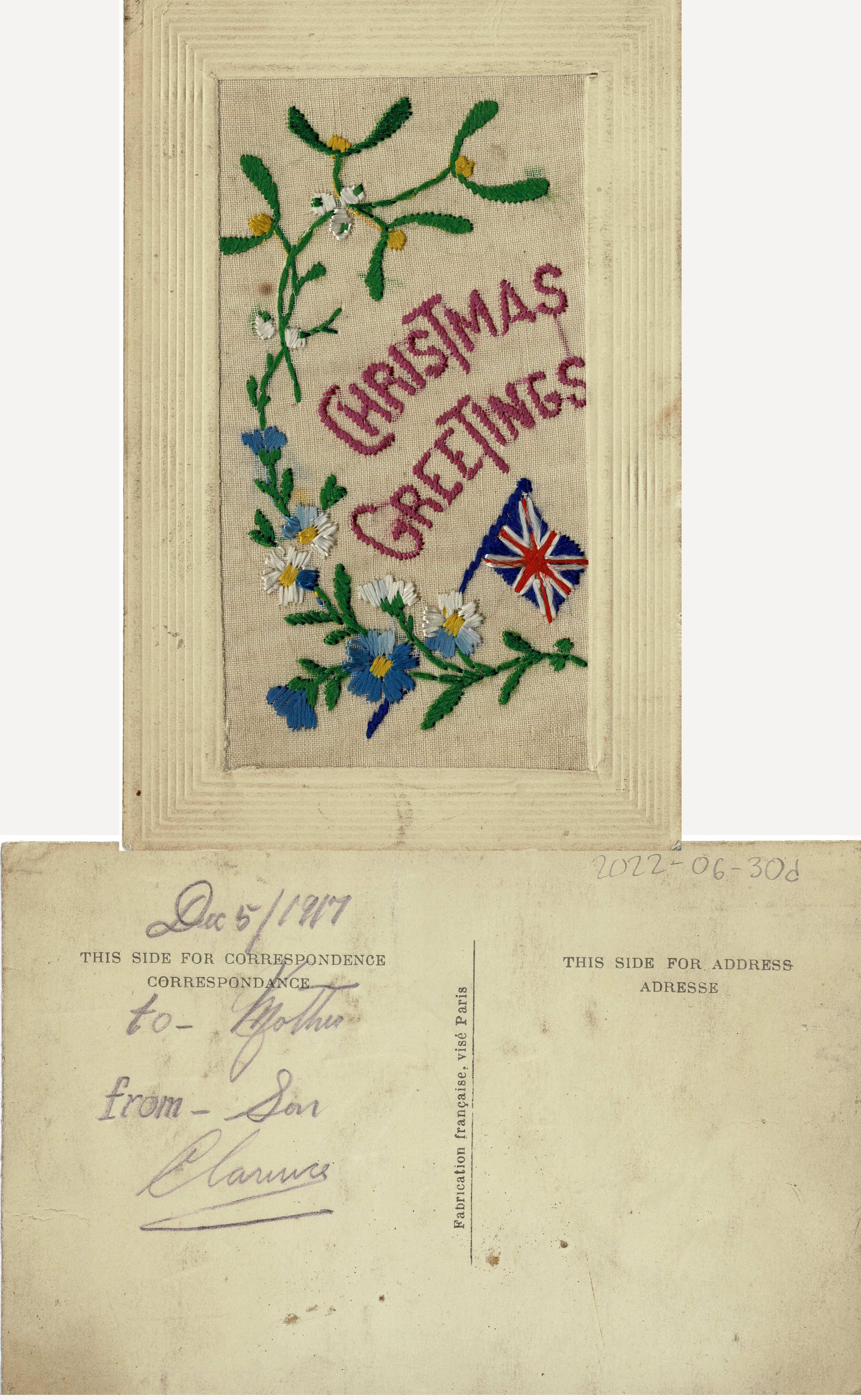 Christmas postcard sent to Janet Mitchell from her son Clarence on December 5, 1917. The front of the postcard says 'Christmas Greetings' with decorative embroidery.