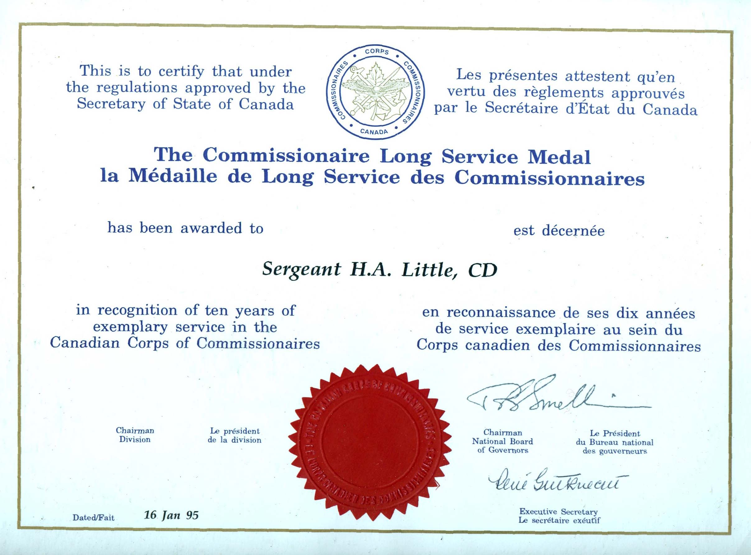 Sergeant Harold A Little was awarded The Commissionaire Long Service Medal in recognition of ten years of exemplary service in the Canadian Corps of Commissionaires, 16 January 1995.