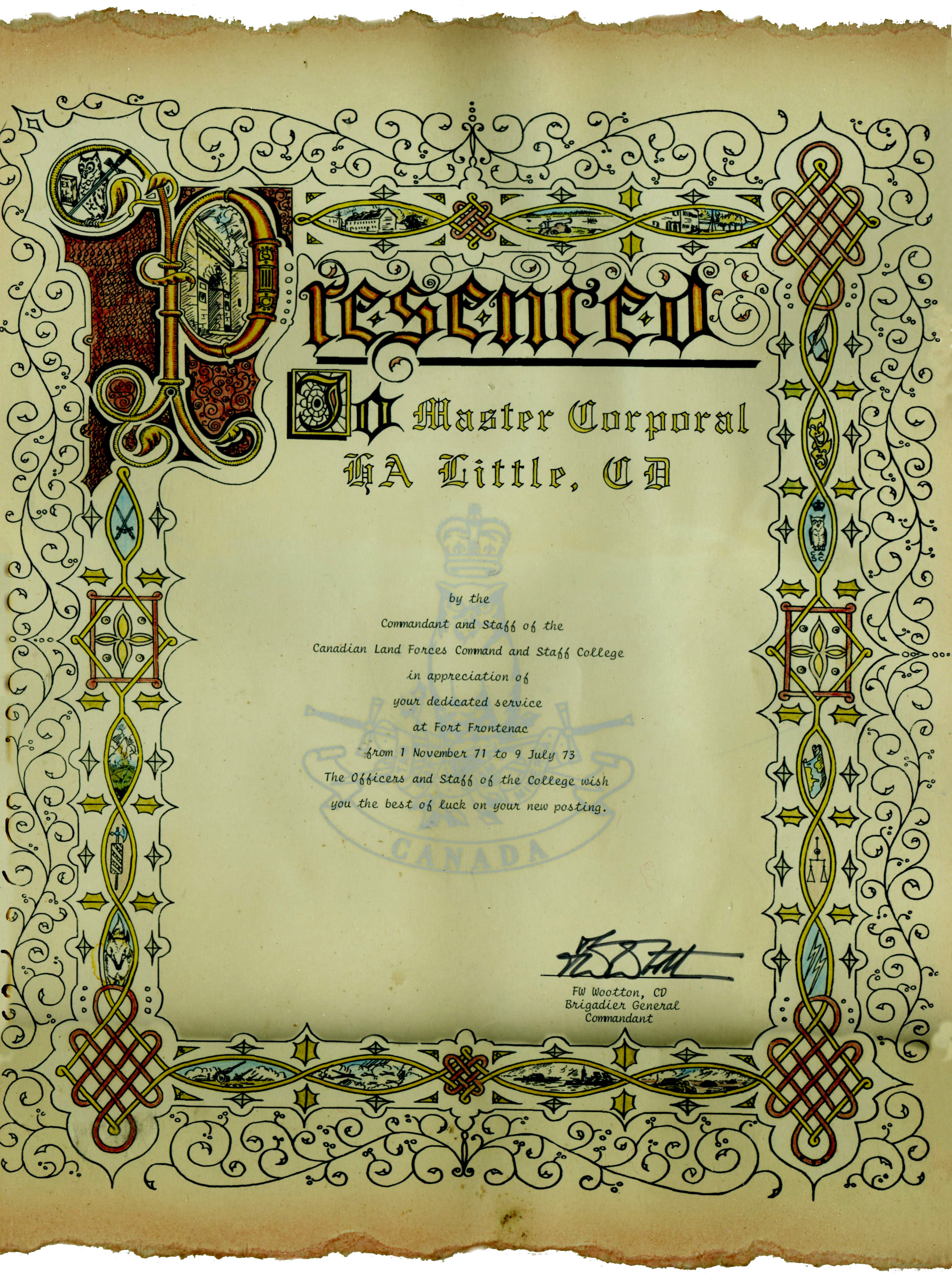 Presented to Master Corporal H A Little, CD by the Commandant and Staff of the Canadian Land Forces Command and Staff College in appreciation of your dedicated service at Fort Frontenac from 1 November 71 to 9 July 73.