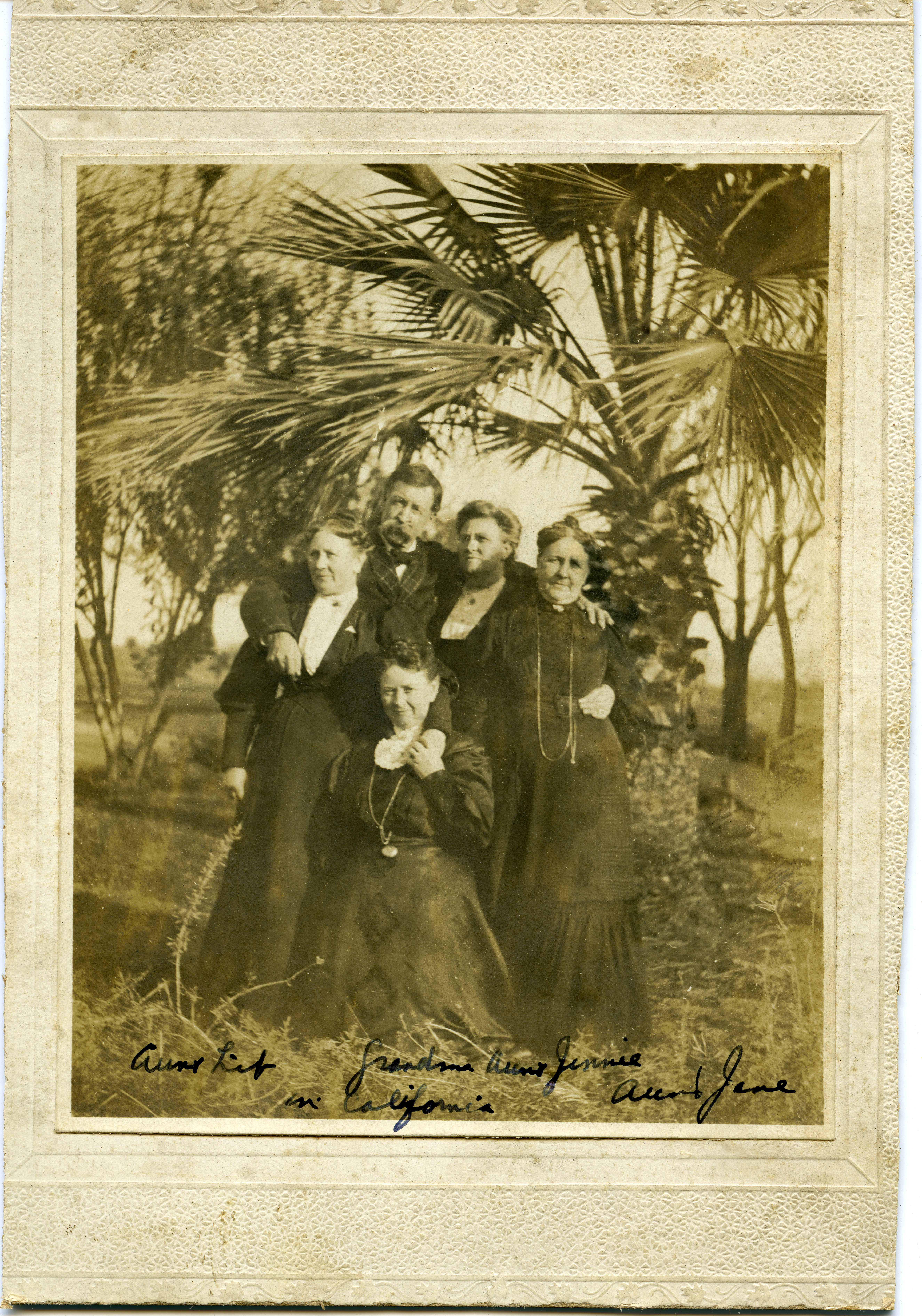 Written on photo from left, Aunt Lib, Grandma, Aunt Jennie, Aunt Jane in California. Written on back of photo: In John (initial) Garden, Phoenix, January 1 st, 1907.