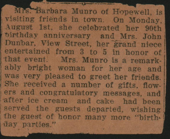 Mrs. Barbara Munro of Hopewell, is visiting friends in town. On Monday, August 1st, she celebrated her 90th birthday anniversary and Mrs. John Dunbar, View Street, her grand niece entertained from 3 to 5 in honor of that event. Mrs. Munro is a remarkably bright woman for her age and was very pleased to greet her friends. She received a number of gifts, flowers, and congratulatory messages and after ice cream and cake had been served the guest departed, wishing the guest of honor many more “birthday parties.”