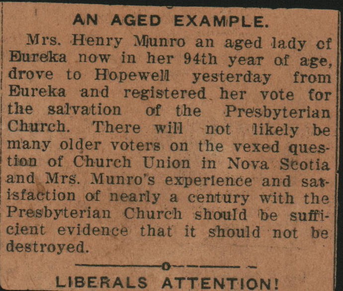Mrs. Henry Munro an aged lady of Eureka now in her 94th year of age, drove to Hopewell yesterday from Eureka and registered her vote for the salvation of the Presbyterian Church. There will not likely be many older voters on the vexed question of Church Union in Nova Scotia and Mrs. Munro’s experience and satisfaction of nearly a century with the Presbyterian Church should be sufficient evidence that it should not be destroyed.