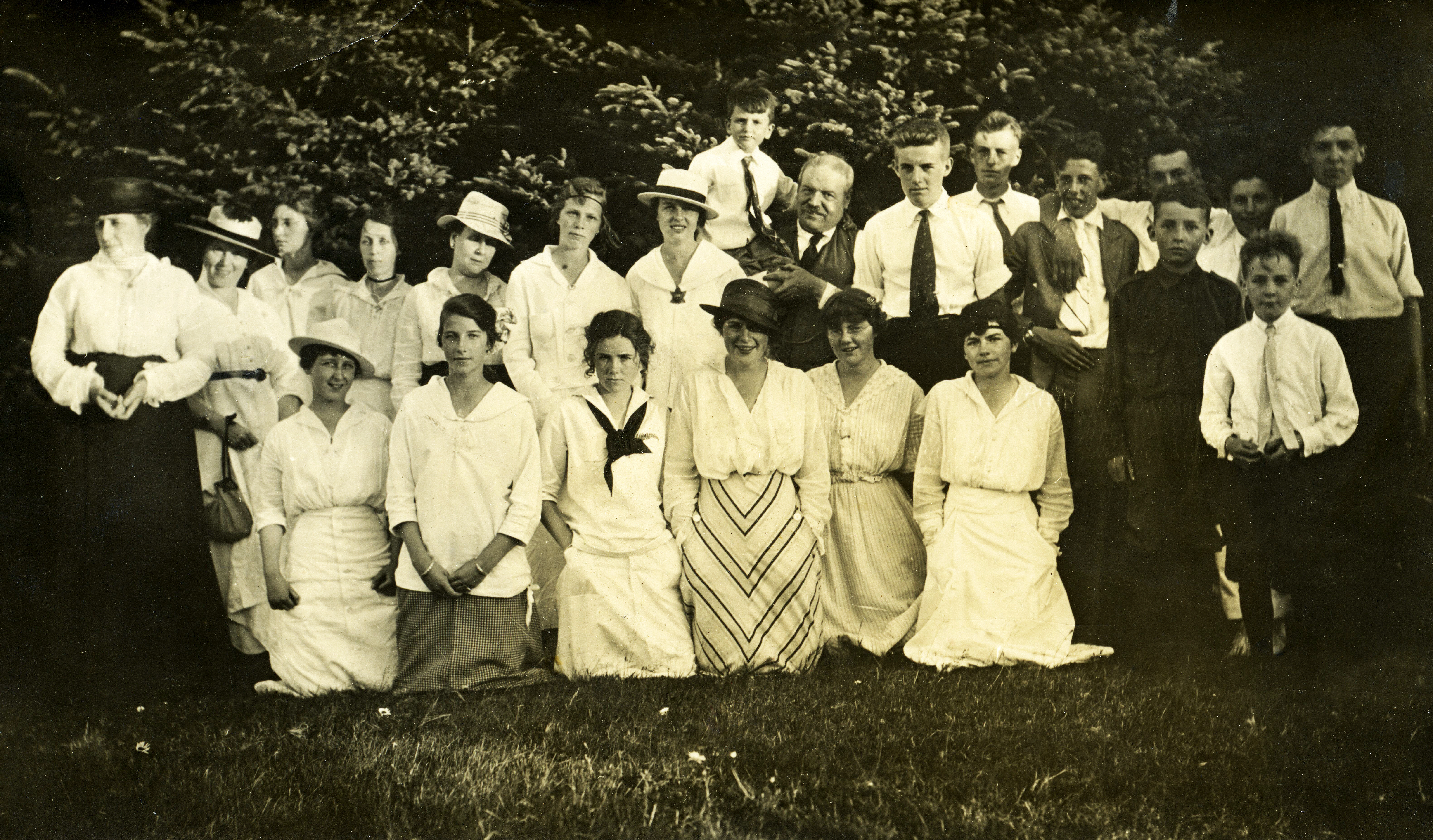 Mrs Peter MacDonald, Mrs Charlie MacDonald, Dorothy Munro, Mrs John D MacDonald, Mrs E M MacDonald, Marjorie? MacDonald, Constance MacDonald, E M Mac Donald Sr, J Shiran Robertson, George Munro, E M MacDonald Jr, unknown, Alvin Smith?, Roy Smith