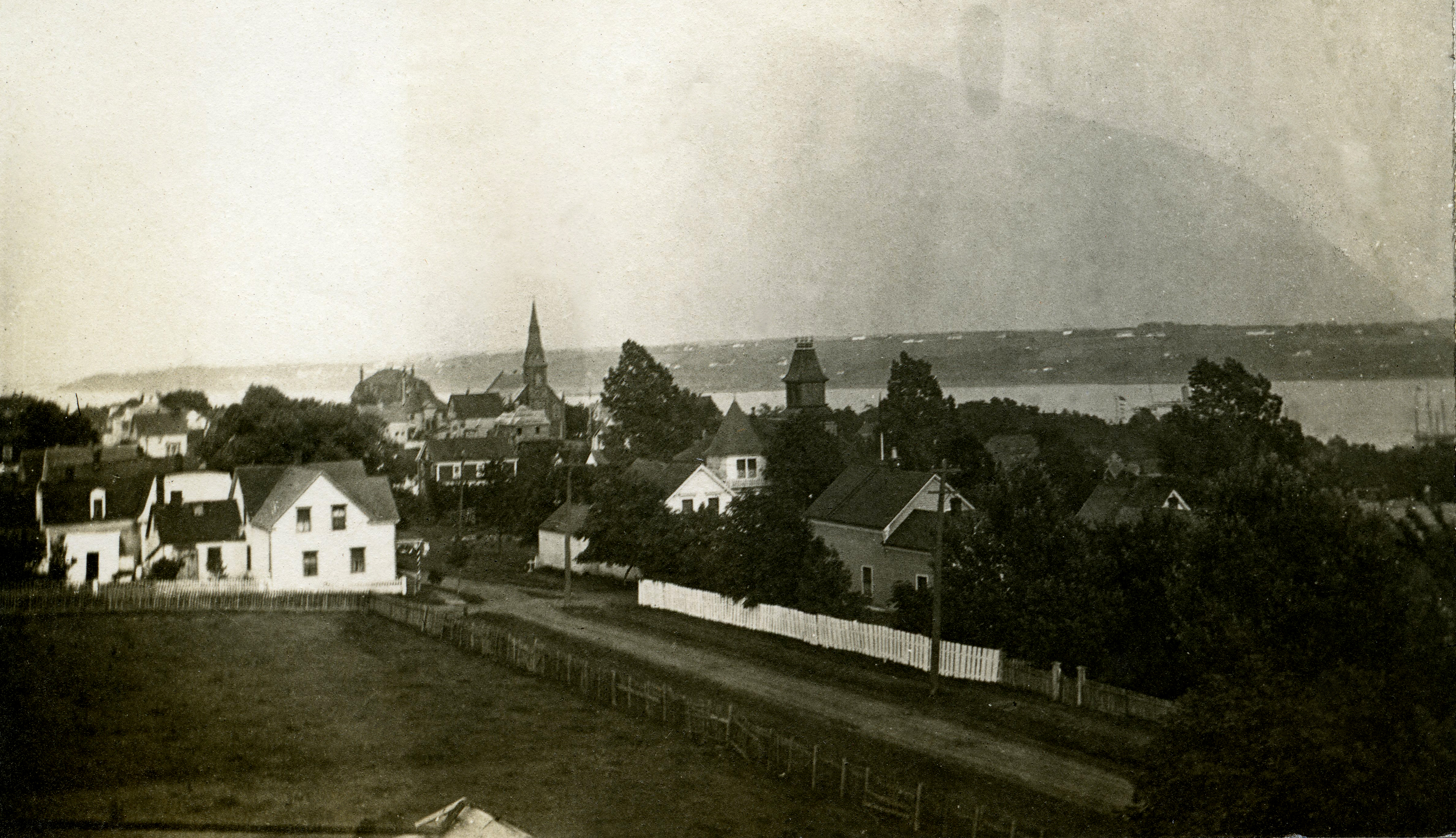 Pictou taken from top of old Fullerton house looking towards the landing. East End School has square dark tower. Pat English's house has white tower. Also seen is the Stella Maris Church.