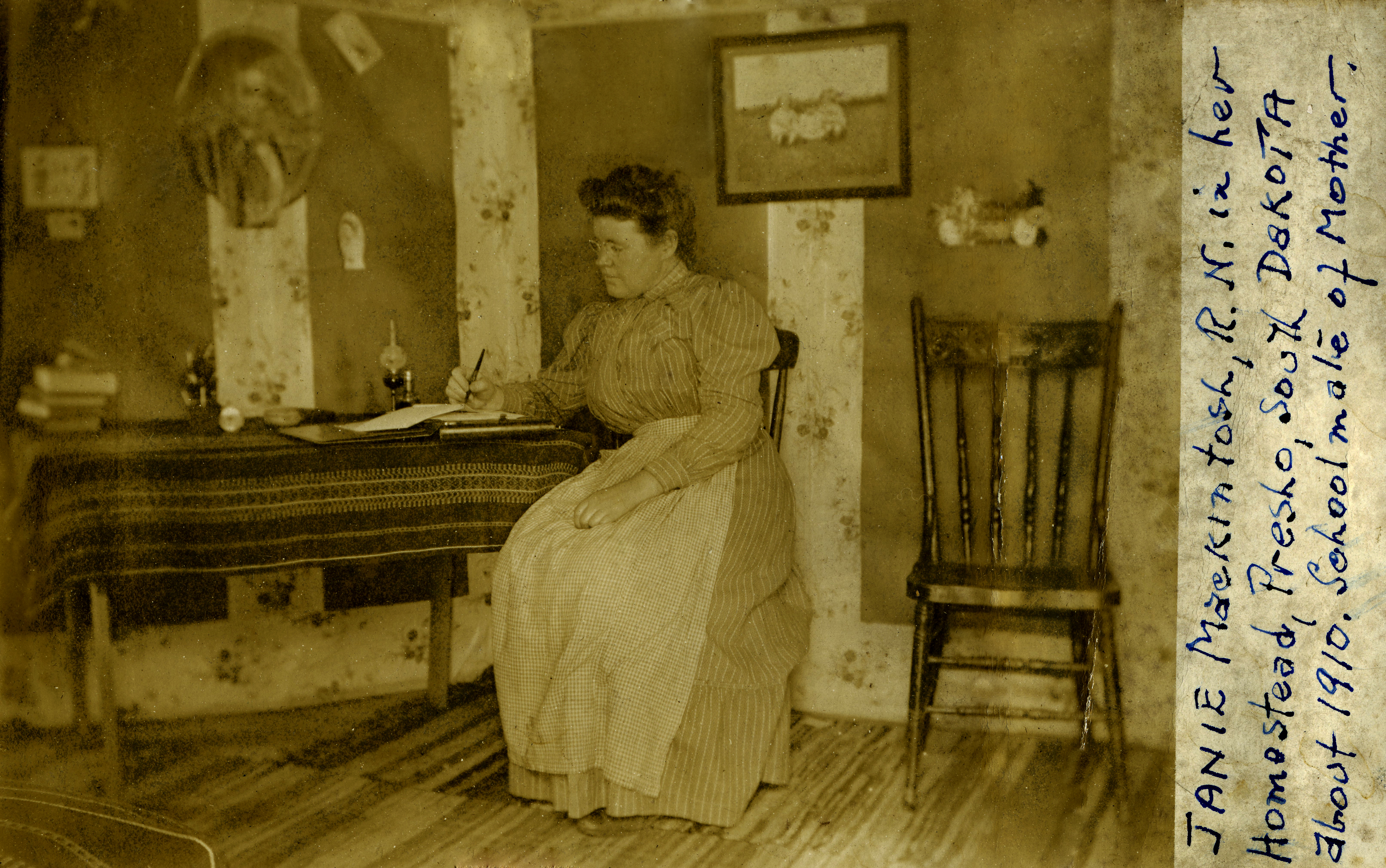 Post card depicting "Janie MacKintosh, RN in her Homestead, Presho, South Dakota about 1910. School mate of Mother".