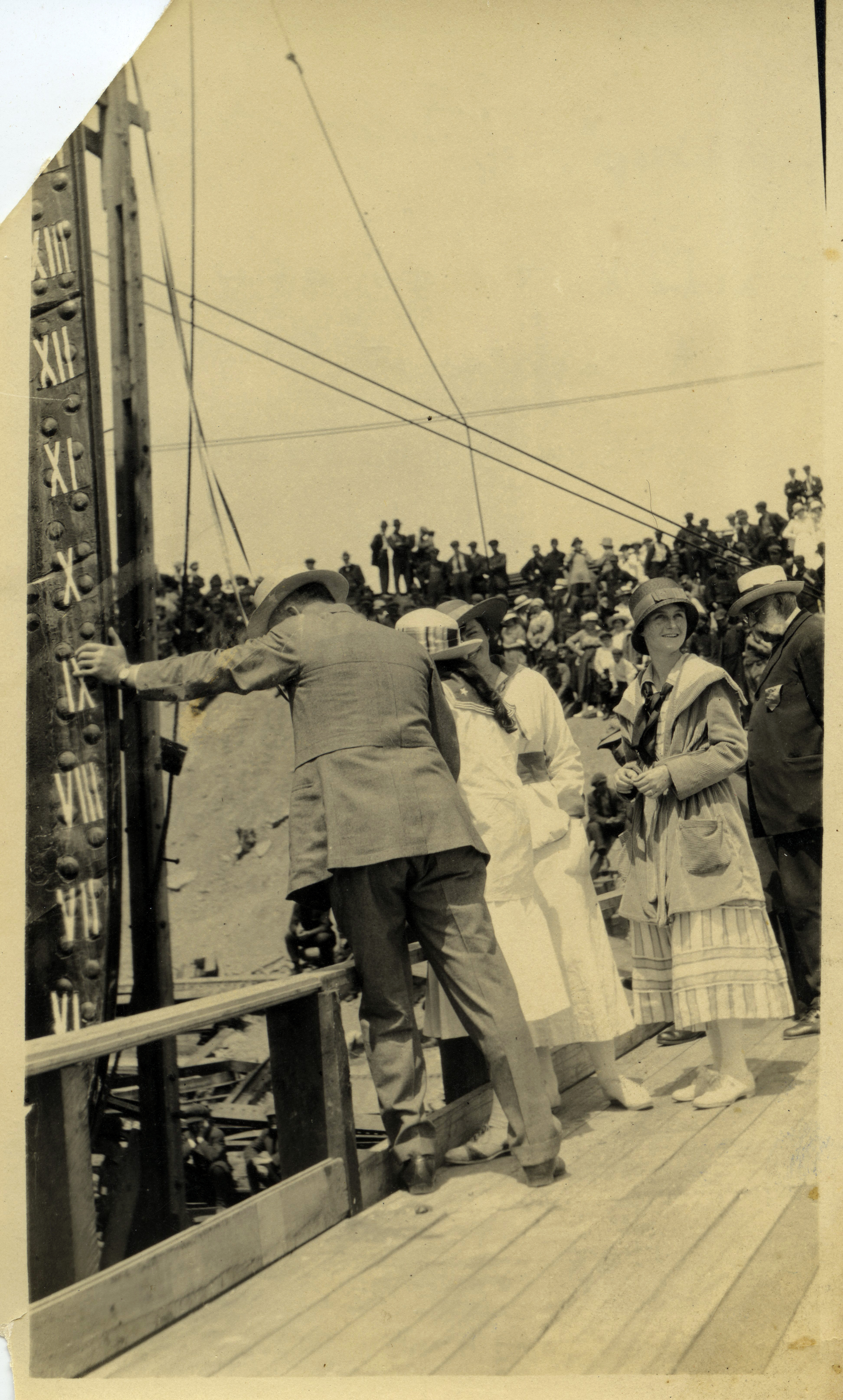 "Thomas Cantley pushing ship, Marian Cantley Hayden to his right in middy blouse."