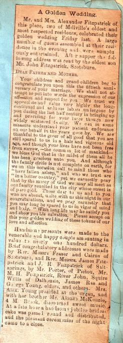 "A Golden Wedding", a clipping from an unidentified and undated newspaper recounting the 50th wedding anniversary celebrations of Alexander Fitzpatrick and Mary Rae.