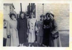 Group gathered on Water Street, Pictou sometime in the 1940s/50s. Ebb Bijeau's Taxi & Henderson Shoes stores in background.