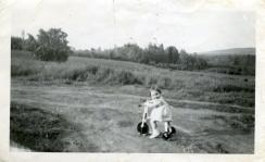 Judy MacLeod, daughter of Beth Dewar and Medford MacLeod, on family farm in West River