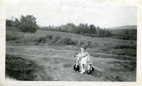 Judy MacLeod, daughter of Beth Dewar and Medford MacLeod, on a tricycle on the family farm in West River