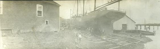 | New Glasgow / Schooner Photo of a ship. | ship slipway men building canoe sample | ||