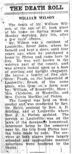 Obituary for William Wilson printed in the Pictou Advocate, 12 July 1929 page 8